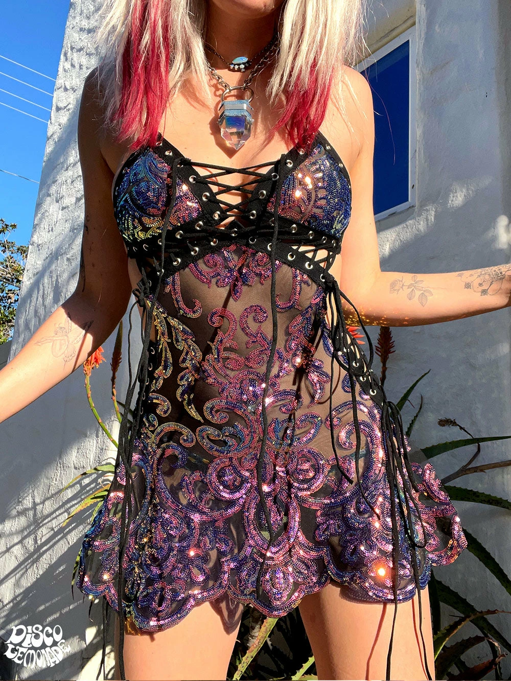 Lace up Disco Dress in radiant beetle fabric with scalloped hem. Sequin on 4 way stretch mesh with black grommet detailing & elastic lace for an adjustable fit.