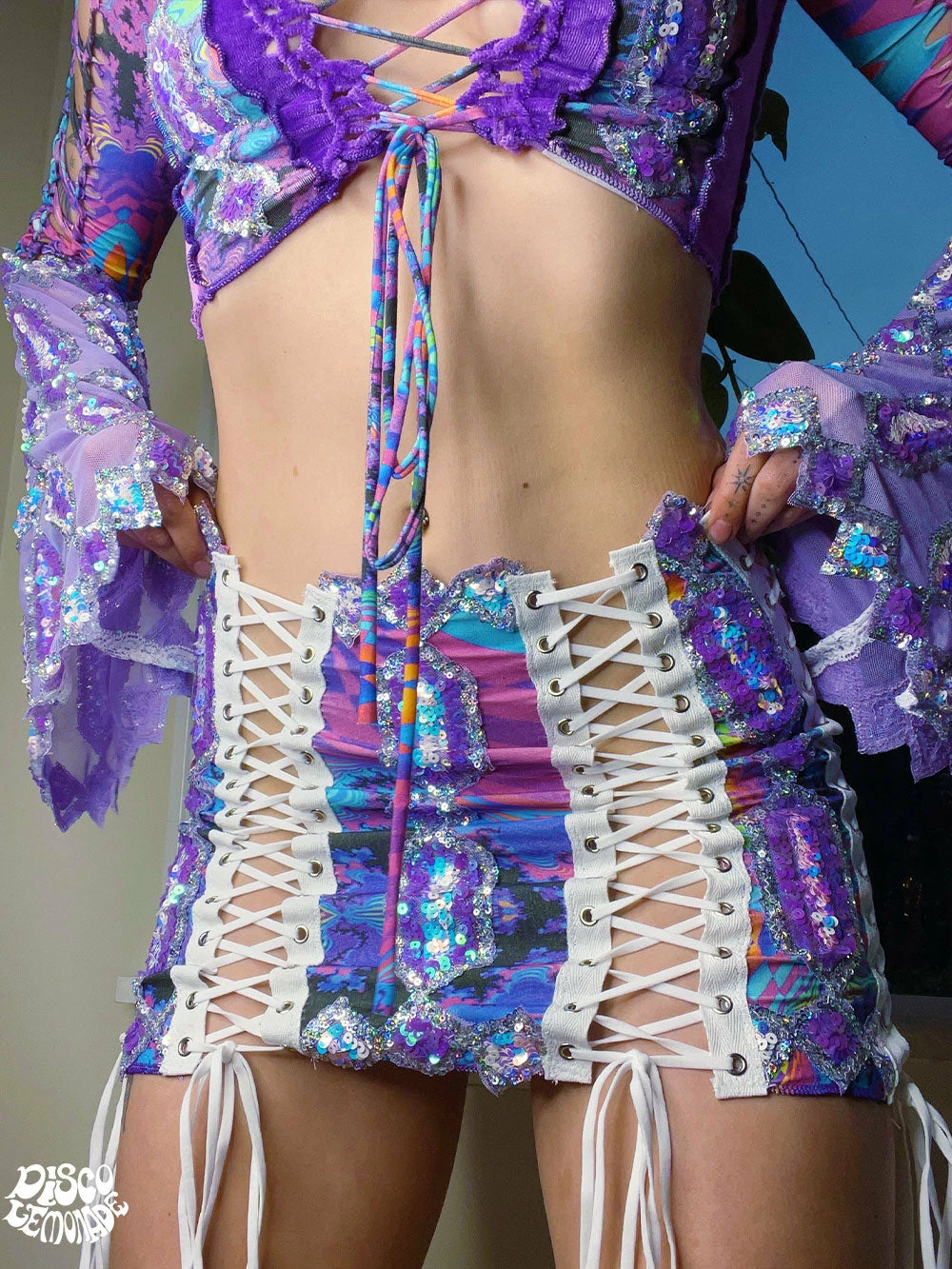 This one of a kind Disco Set comes with signature patchwork psychedelic braided top by Astralvisions Designs with sequin sleeves & detailing & lace up Disco Skirt with sequin detailing sewn on to Astral’s iconic psychedelic fabric.
