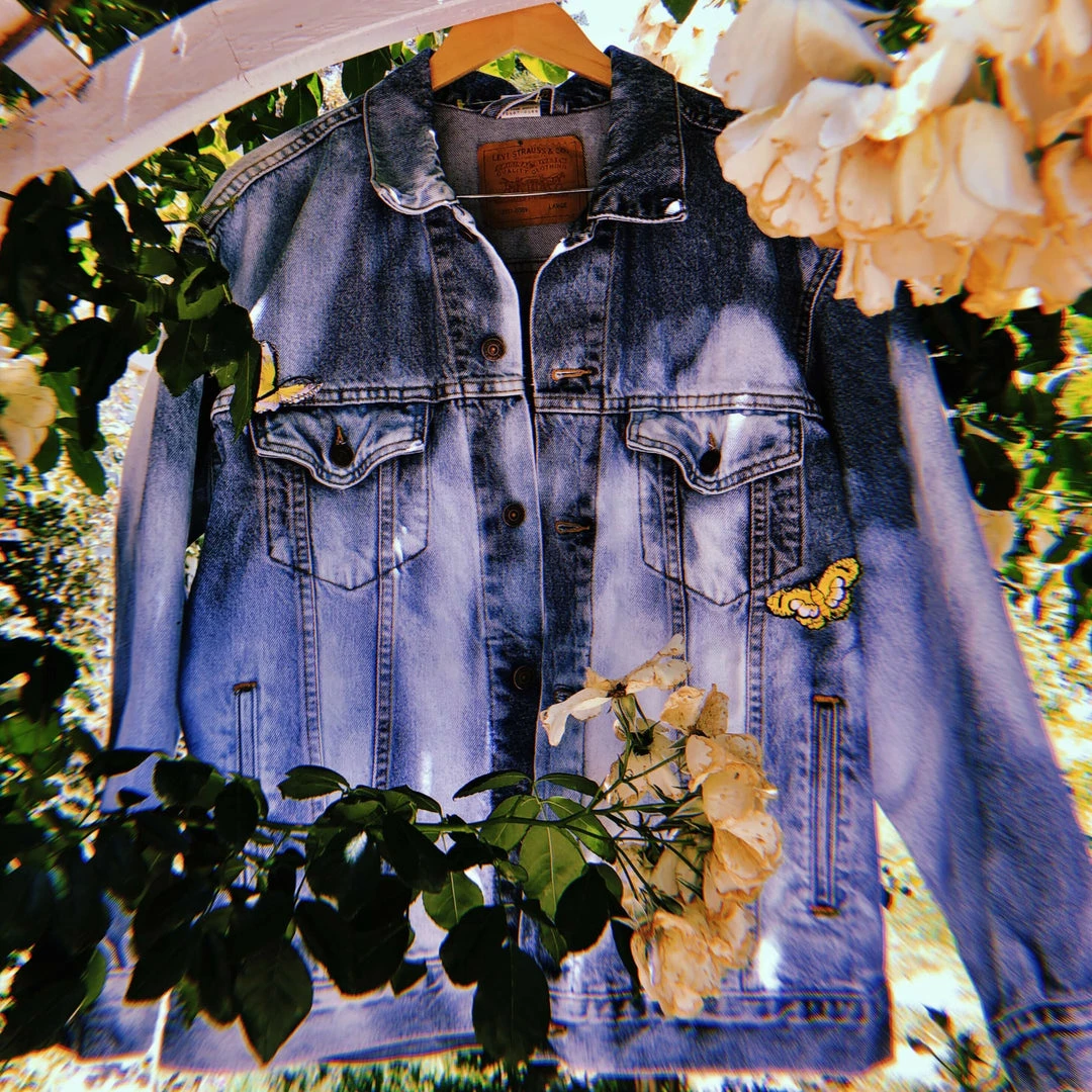 An oversized vintage reworked Levi’s denim jacket from Funky Fresh Shop ~ acid-washed with Black Lives Matter sequin lettering & embroidered butterflies. One-of-a-kind | Ready 2 Ship