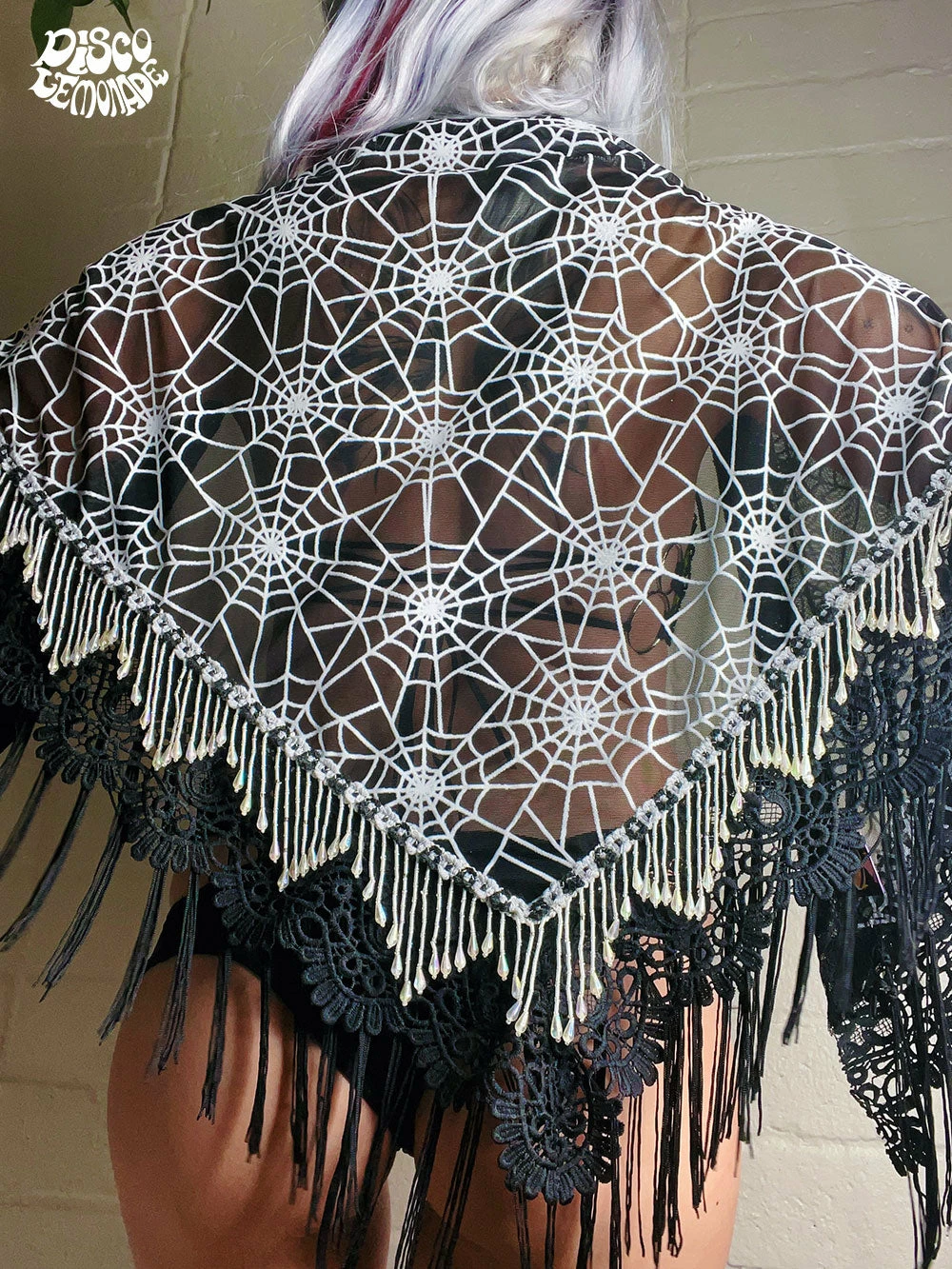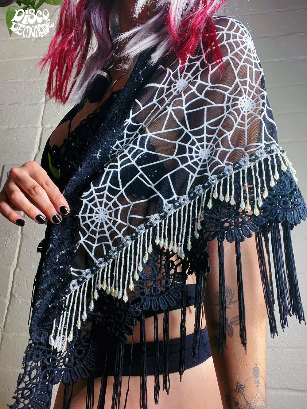 Red spiderweb Goddess Shawl ~ with black fringe, black lace & gorgeous beaded trimming ~ perfect for spooky szn!