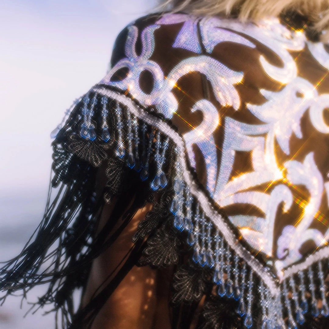 A mystical water creature flowing with the waveZz of the ocean ~ all my Cancer babieZZ wherever the sign may lie in your chart ~ this shawl was inspired by you & the sea ~ Alluring to say the least, this whimsical piece will make you feel like a dancing fairy floating across the open sea