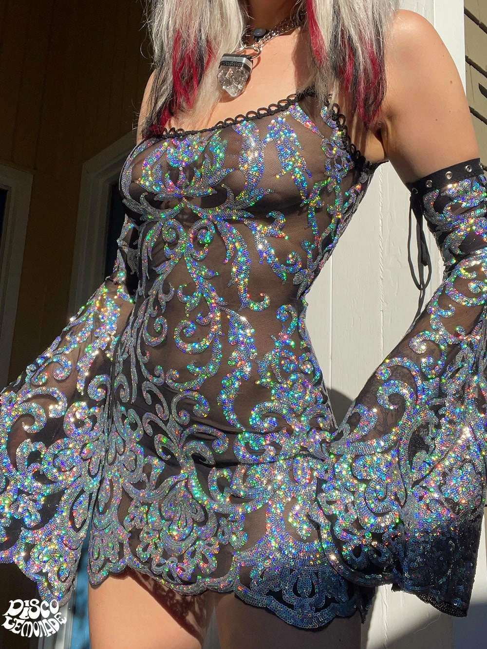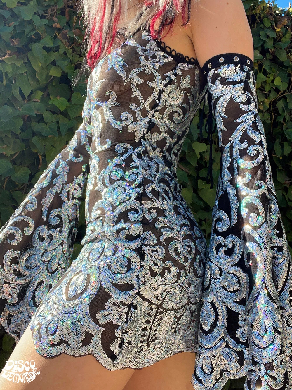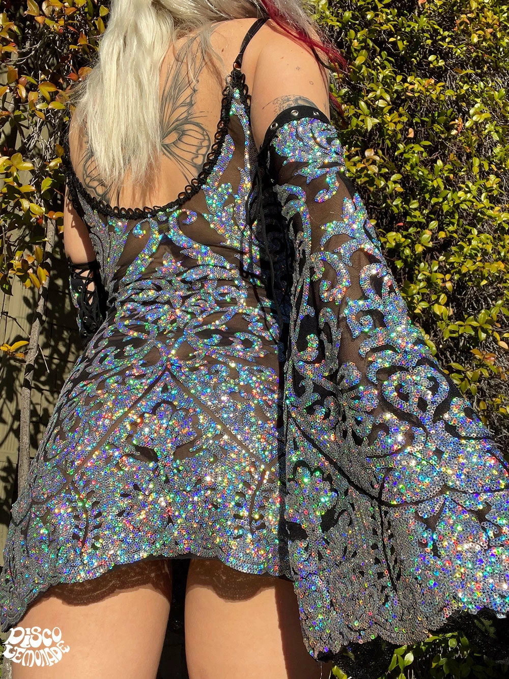 Bodycon silver rainbow sequin on 4 way stretch mesh dress. Seams are covered with lace to prevent scratchies! Adjustable bra straps.