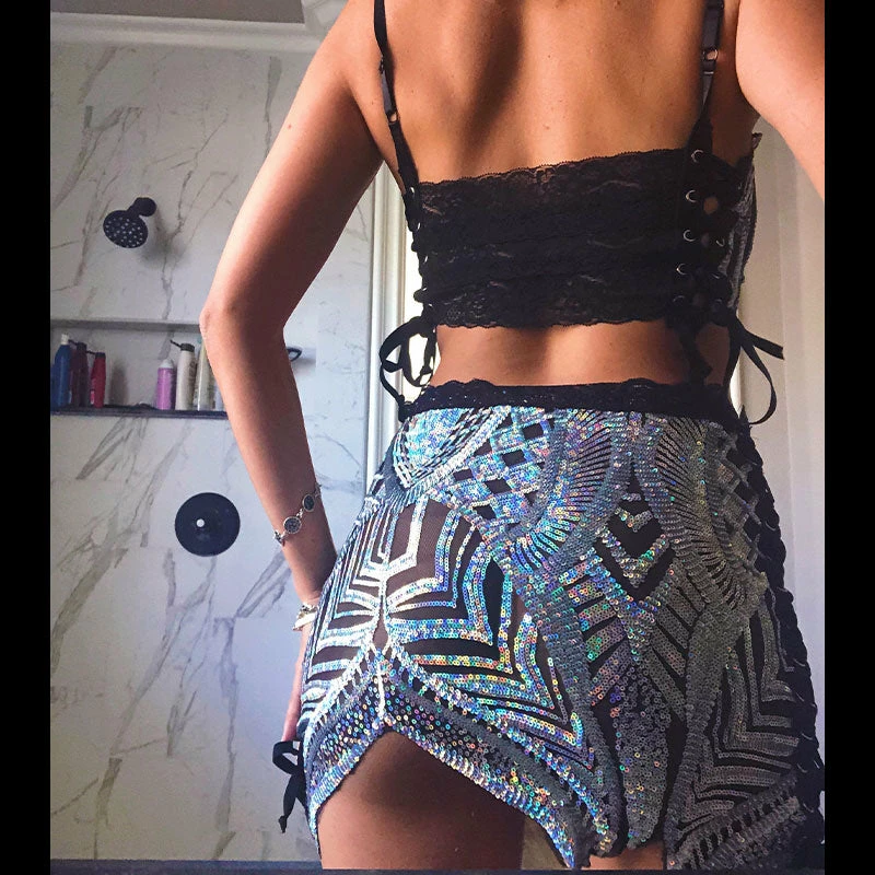 The Dark Star Disco Set is truly something special ~ the top was created corset style with tie up adjustments on the sides and back with adjustable straps ~ The Set comes with a matching tie up skirt with adjustable tie up grommets on both sides ~ created out of gorgeous silver rainbow iridescent fabric you are going to look like you are queen of the DARK STAR.