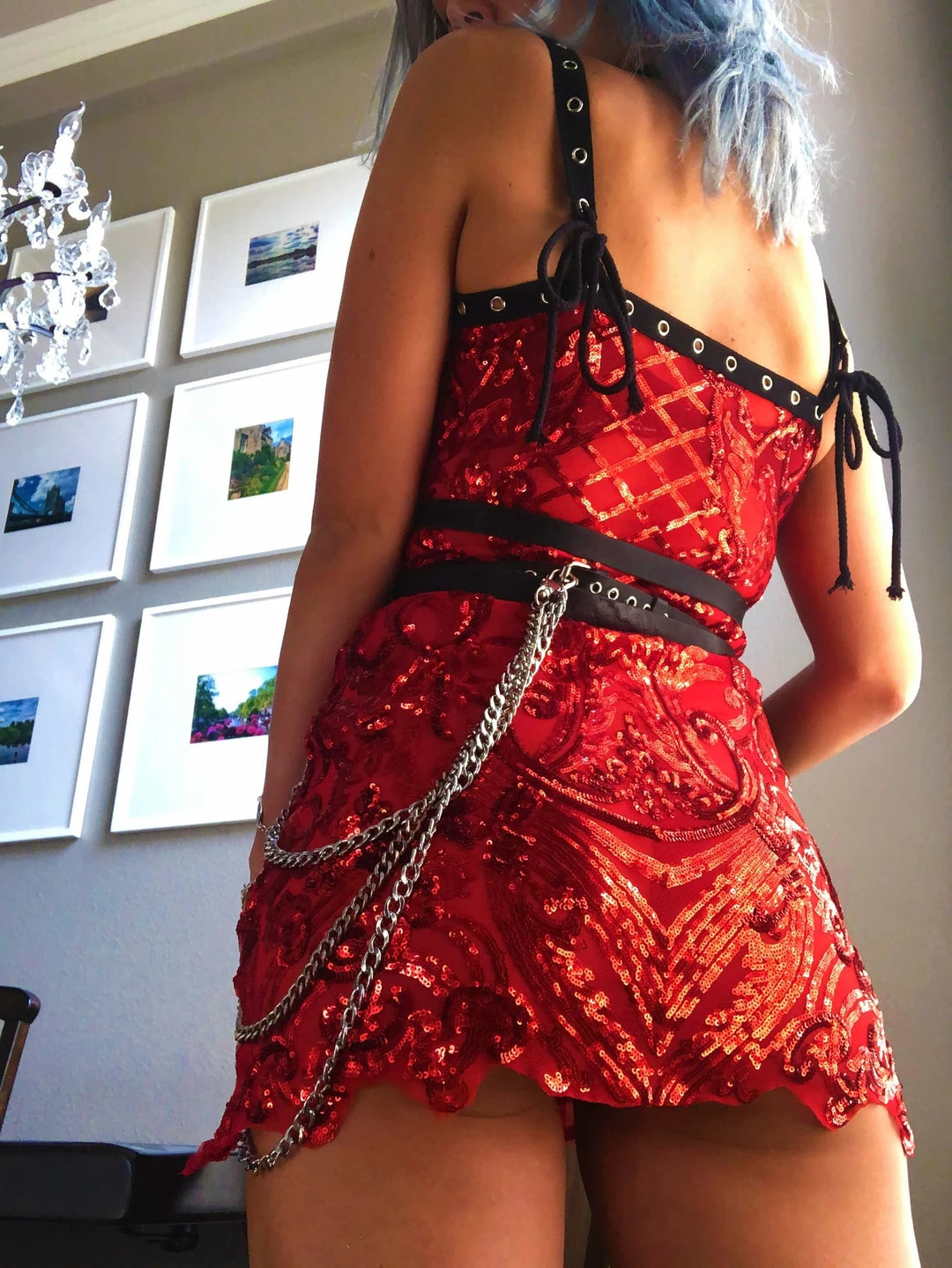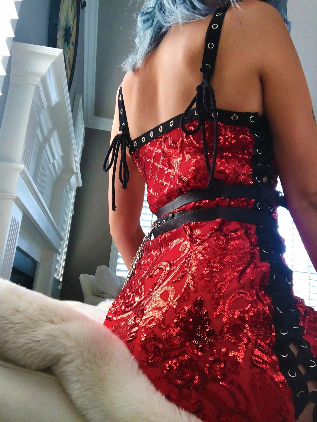 Red sequin dress with lace up ties on one side & grommet detailing/straps
