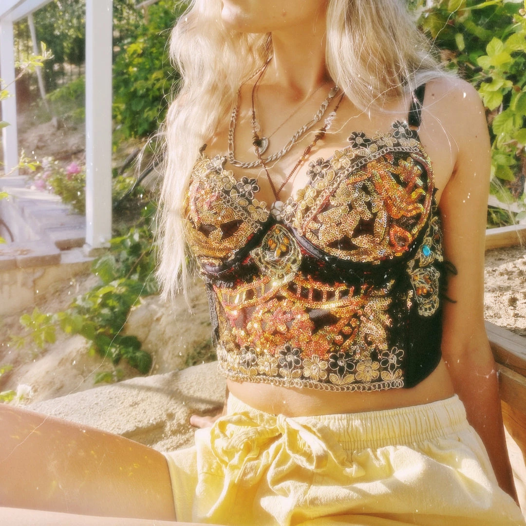 The Fire Goddess Disco Bra is a reworked vintage longline bra from Funky Fresh shop ~ with golds, oranges & yellows this piece shines all the colorZ of the sun ~Â