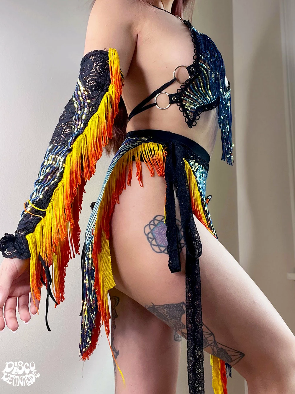 Flame arm bands with ombre orange and yellow fringe.