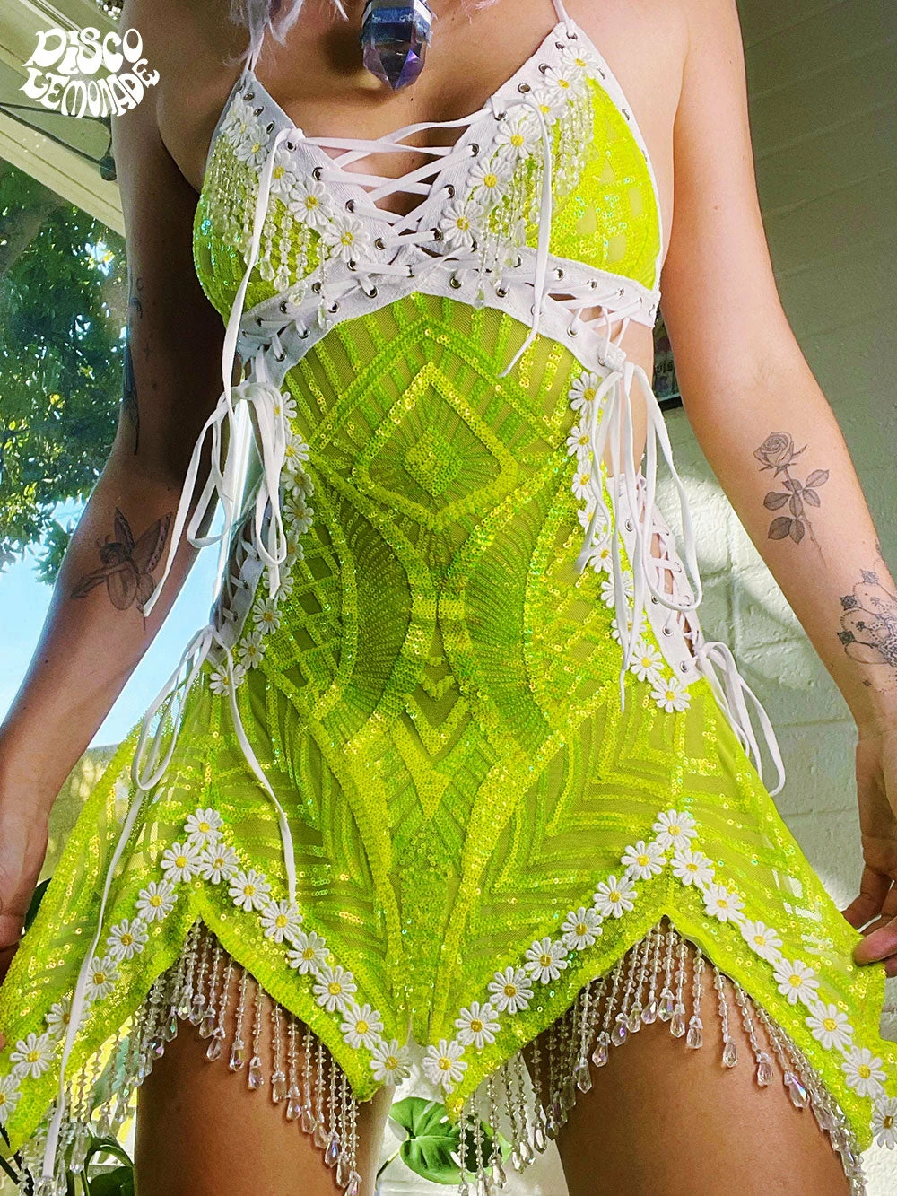 One of a kind iridescent neon lime green Disco Dress with beaded trimming & daisies.