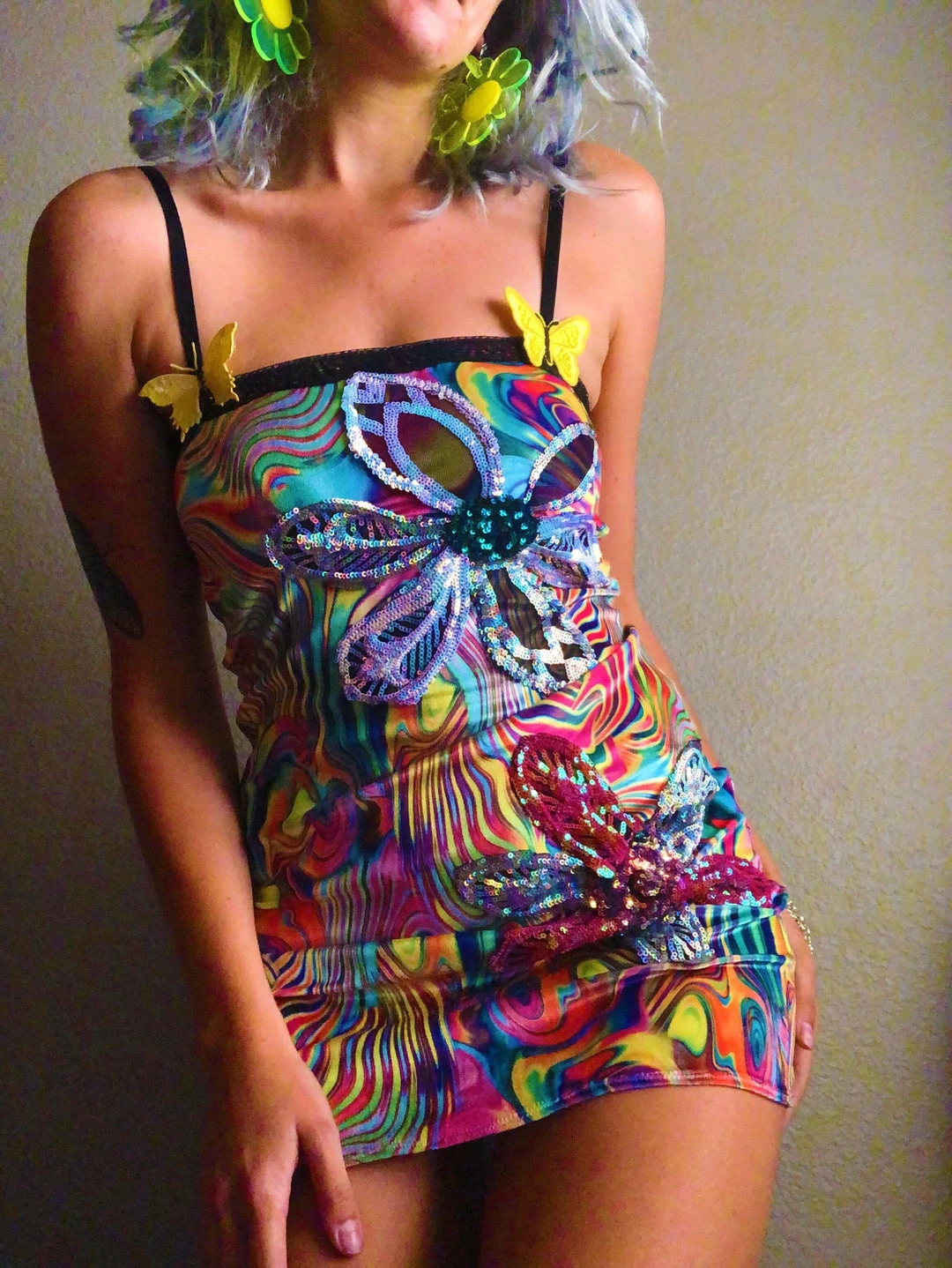 The gogo dress of your DREAMZ! psychedlic rainbow swirl velvet fabrics with butterfly embellisments, lace up ties on one side, adjustable straps & sequin flower detailing.