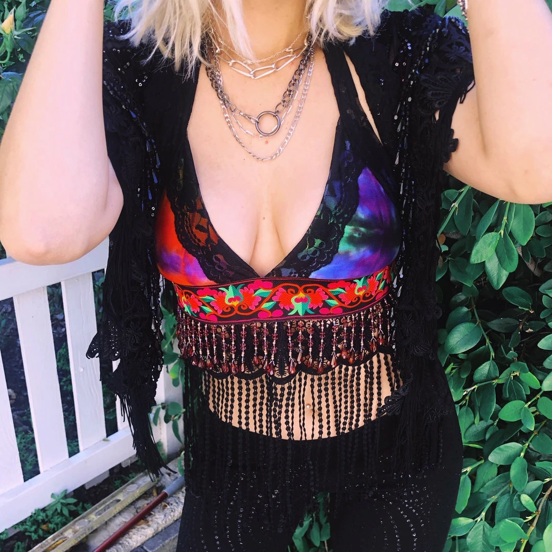Recycled fabric from angel PSYdye {IG}~ the Electric Kool-Aid Disco Top is perfect for your next T R I P to another level of consciousness ~ Rainbow tie dye, a neon pink, green & yellow floral band atop purple crystal beading & black lace~ you will be G L O W I N G anywhere & everywhere you go in this colorful piece ~