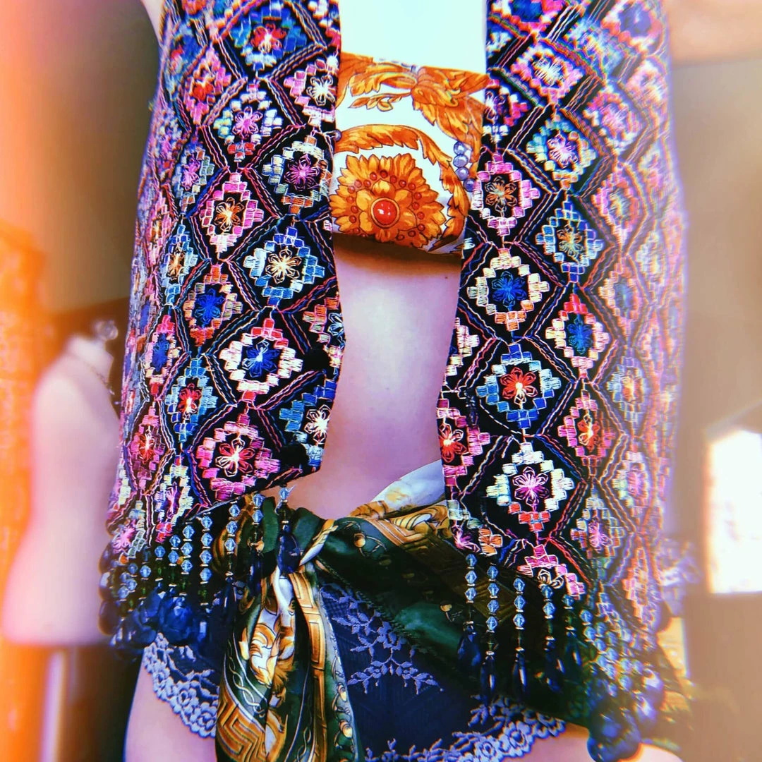 Reworked vintage vest from Funky Fresh Shop with embroidered rainbow diamond pattern & chunky blue & turquoise beading