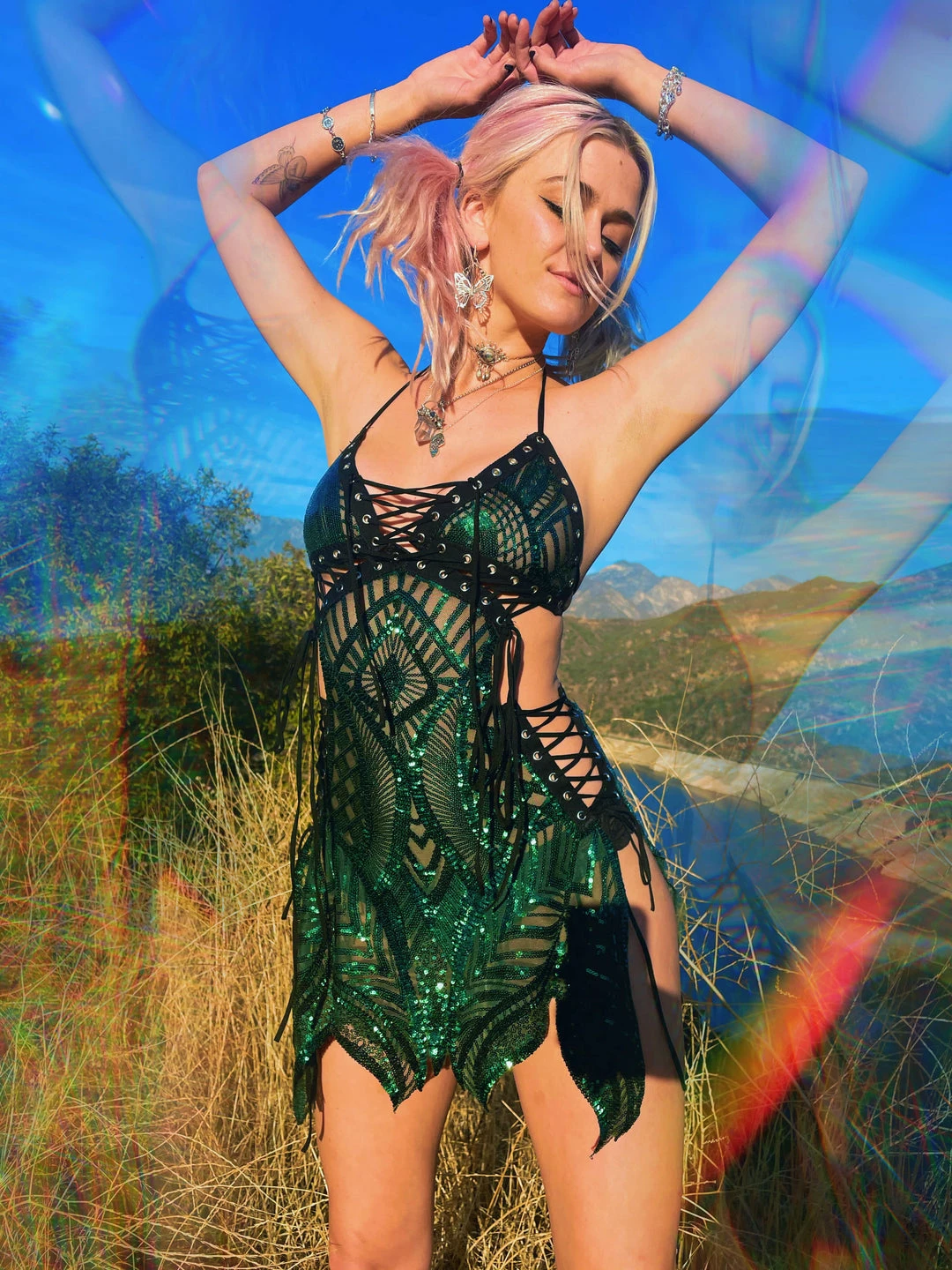 The Forest Fairy Disco Dress is a Tinkerbell dream. Constructed with forest green sequin fabric, this piece is perfect for fulfilling your fairy lifestyle. With lace up ties on the cups and waist, this piece is super adjustable & dreamy.Â