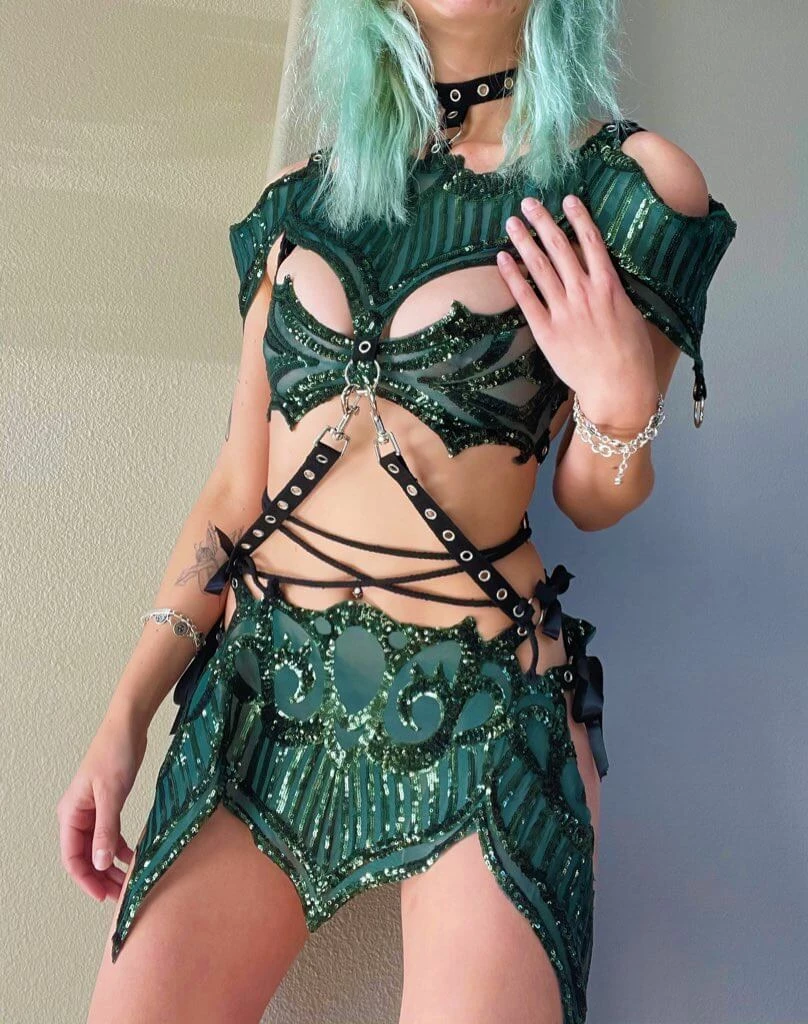This one of a kind Disco Set is made for the fairy warrior goddess. Forest green shoulder pads with hardware accents, and a harness that wraps around your underbust. A strapless Disco Top with lace up back & a sexy mini skirt, this piece is special af.Â