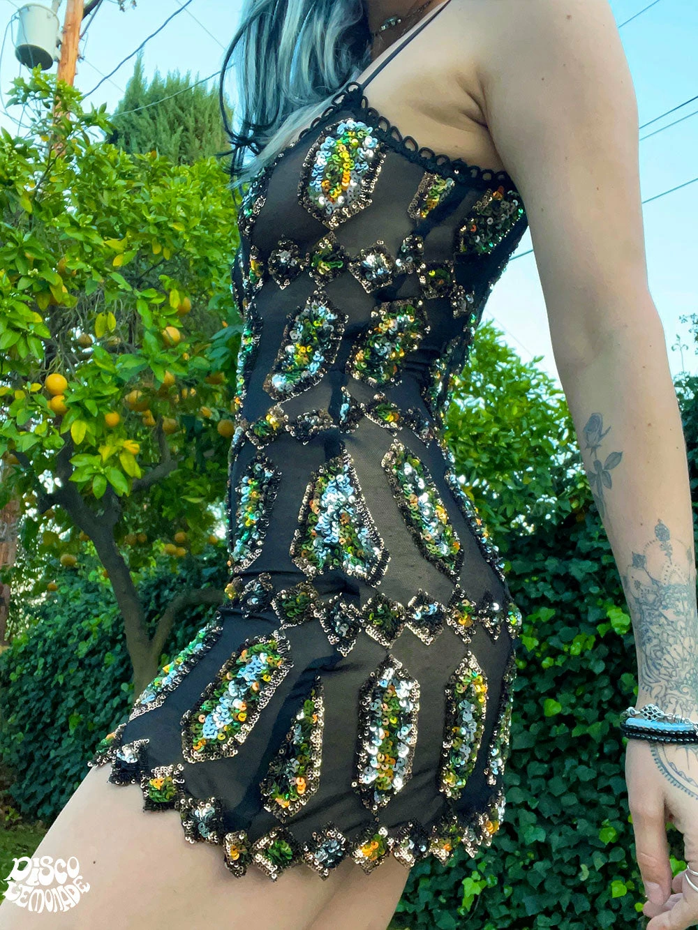 Bodycon green, gold, & yellow sequin on black 4 way stretch mesh dress. Seams are covered with lace to prevent scratchies! Adjustable bra straps.