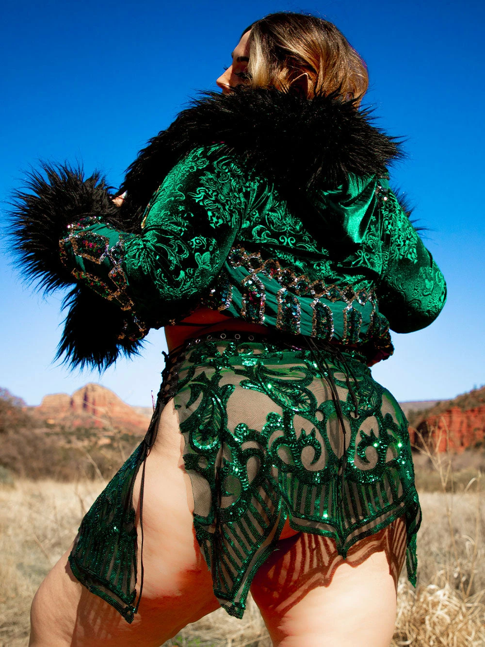 Inspired by the queen Betsey Johnson, this Disco Dress is a garden in dress form. Forest green sequin on green 4 way stretch mesh with floral embellishments & lace up ties.