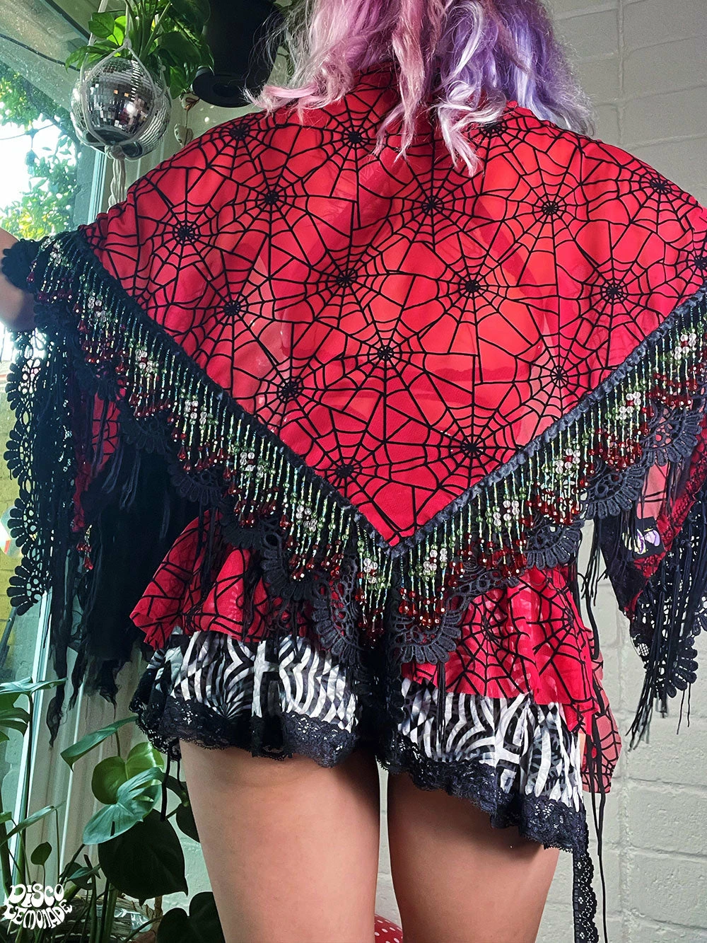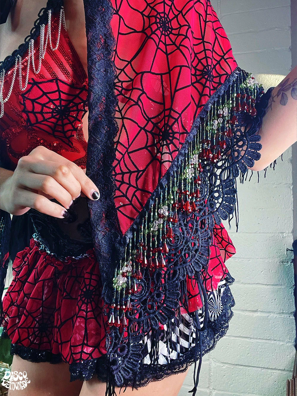 Red spiderweb Goddess Shawl ~ with black fringe, black lace & gorgeous beaded trimming ~ perfect for spooky szn!