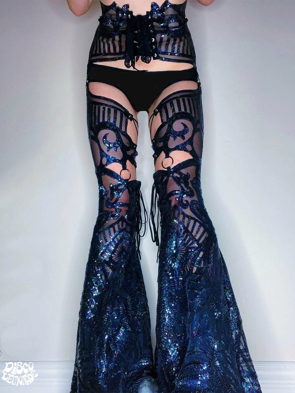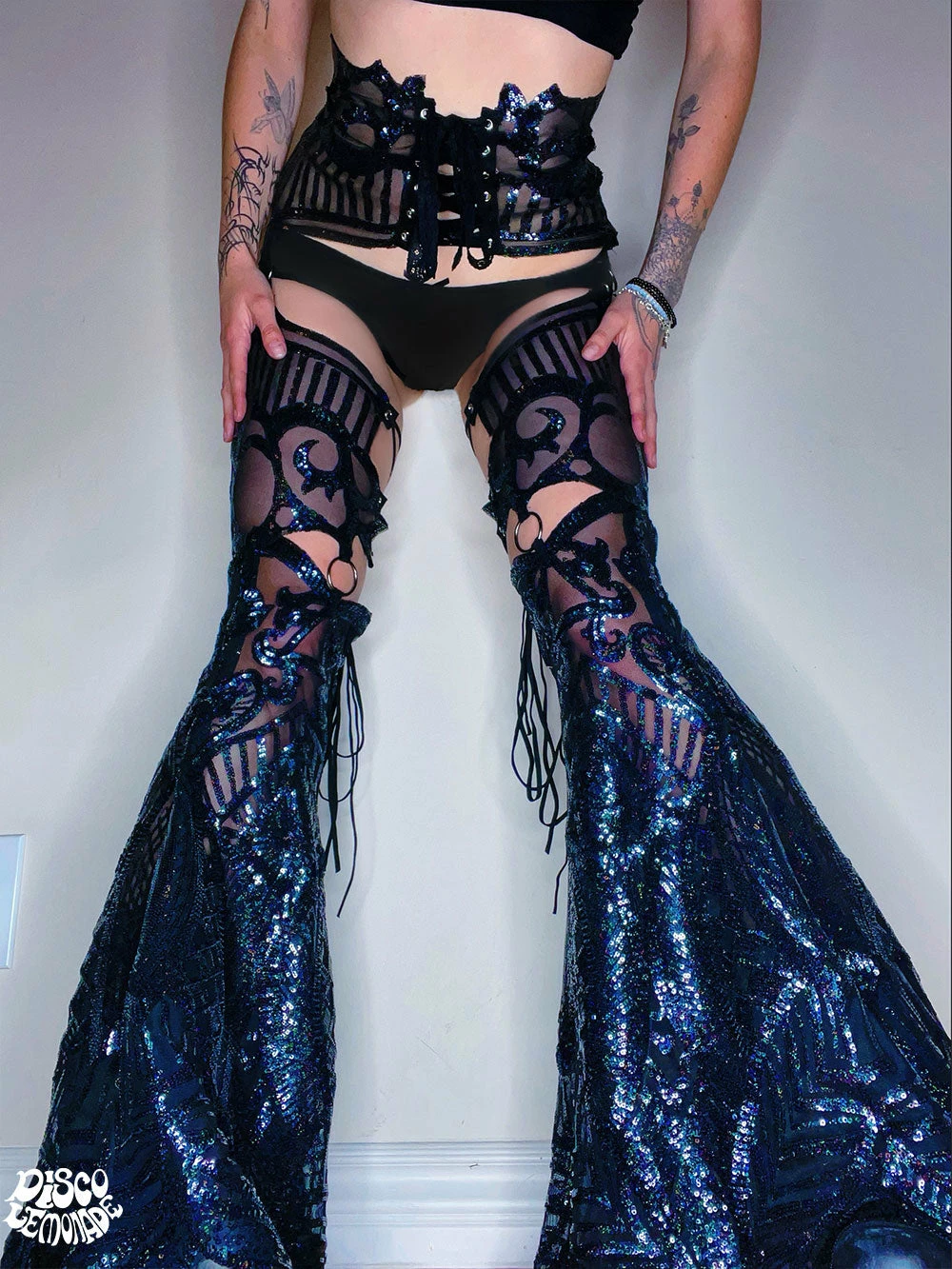 The sexiest chaps of all time. Fairy Gothmother iridescent sequin on 4 way stretch black mesh chaps with lace up.