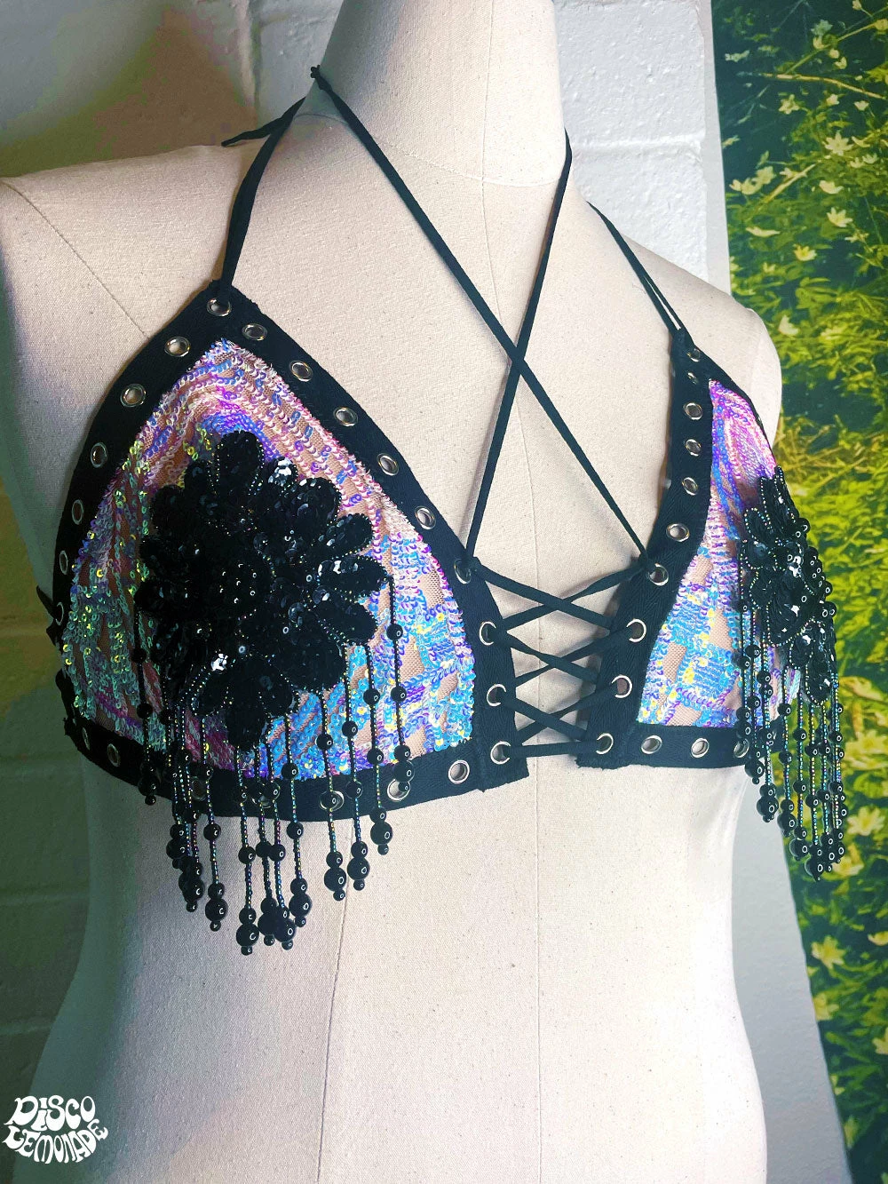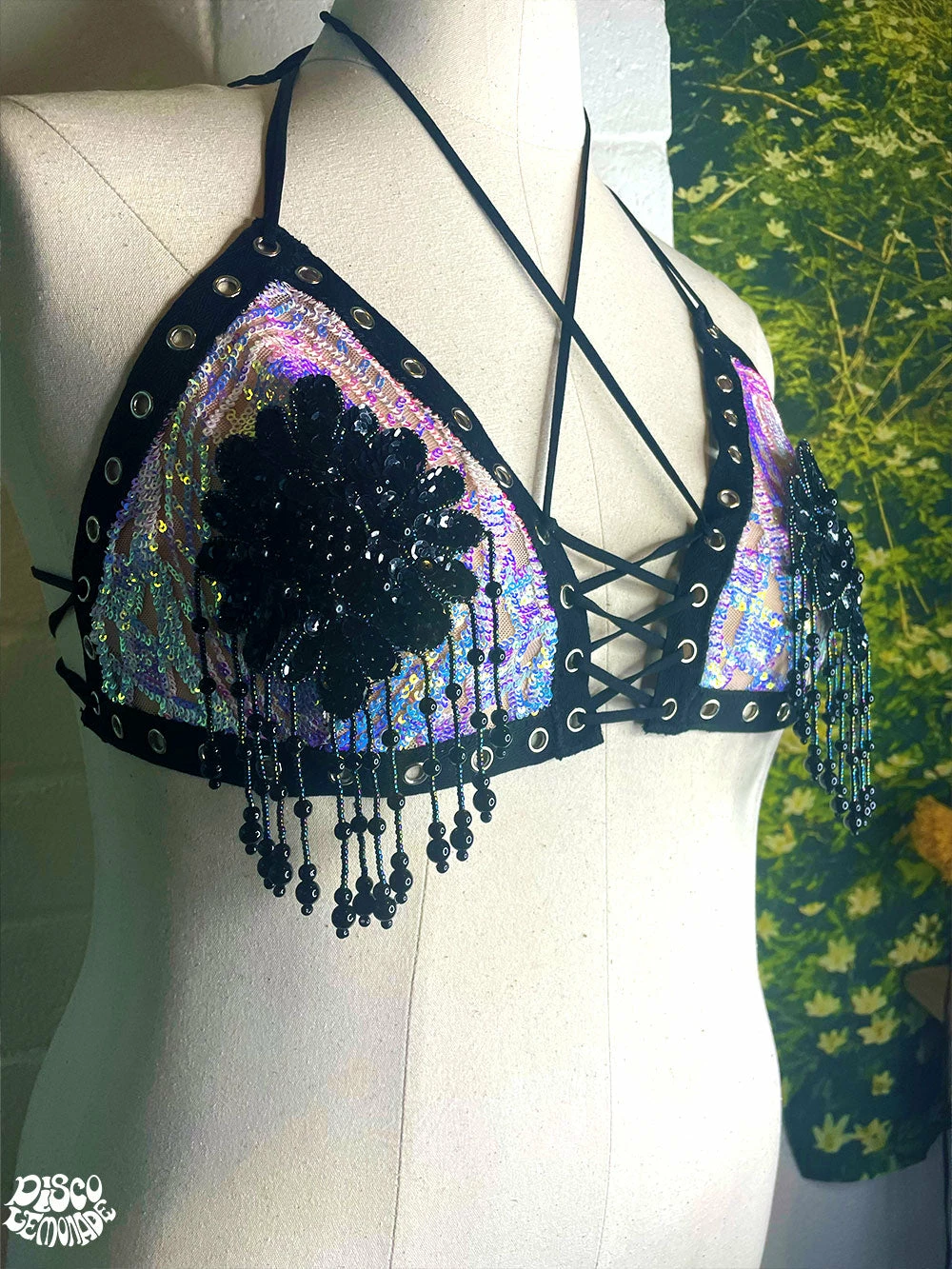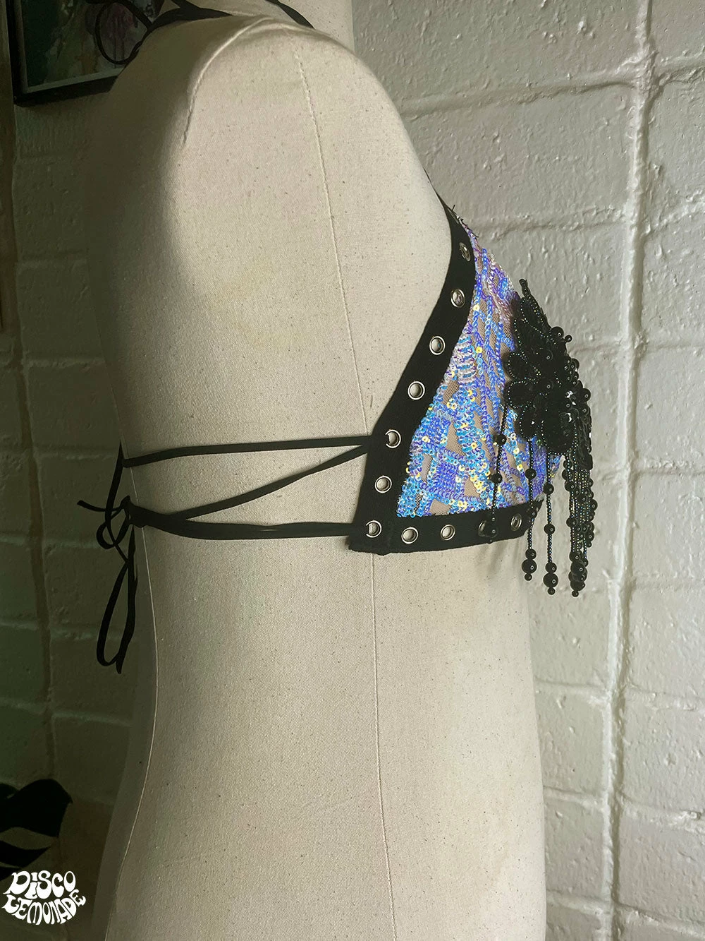 Iridescent ice on nude mesh sequin Lace Up Disco Top with black lace up grommets for a comfortable, adjustable fit & beaded embellishments.