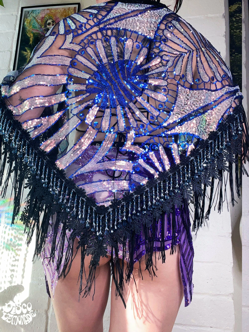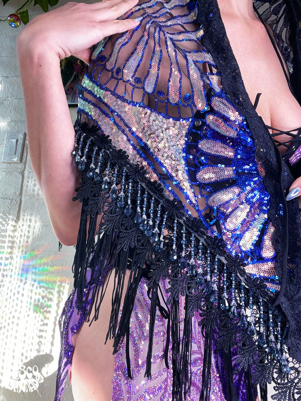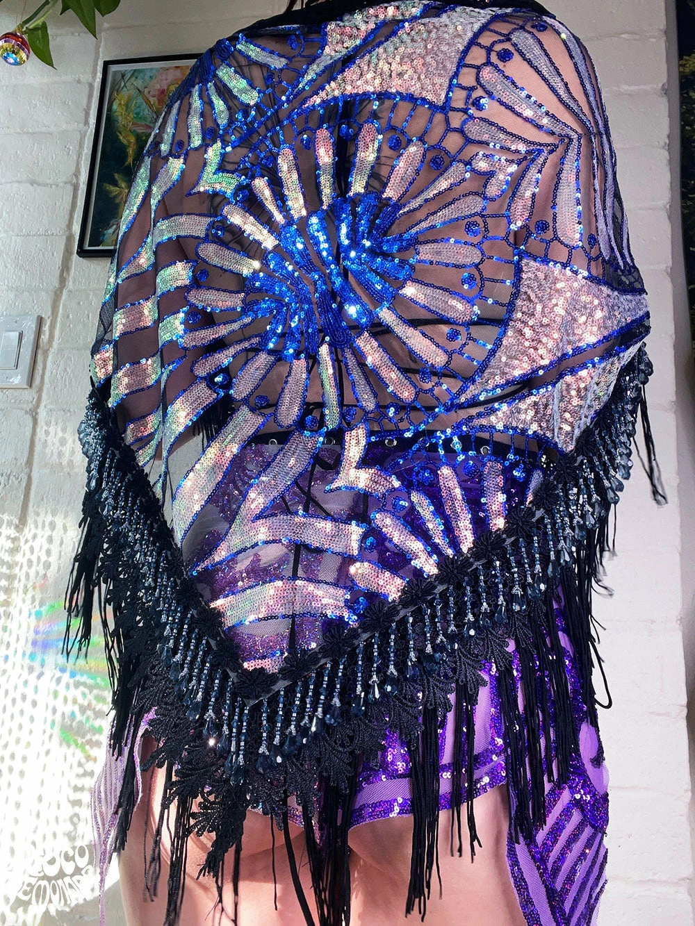Blue, black & pink trippy sequin (non stretch) Goddess Shawl ~ with black fringe, black lace trimming & beading.