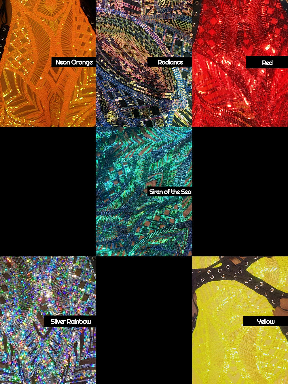 Astral Pixie lavender, hot pink iridescent, lavender green iridescent, icy blue, forest green, orange iridescent &, blush iridescent, icy blue on nude mesh iridescent.