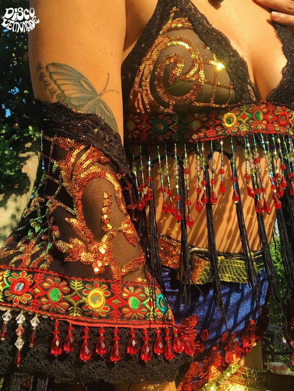 Orange and yellow sequin fabric & maroon, red detailing ~ All Disco Tops & Shawls will slightl