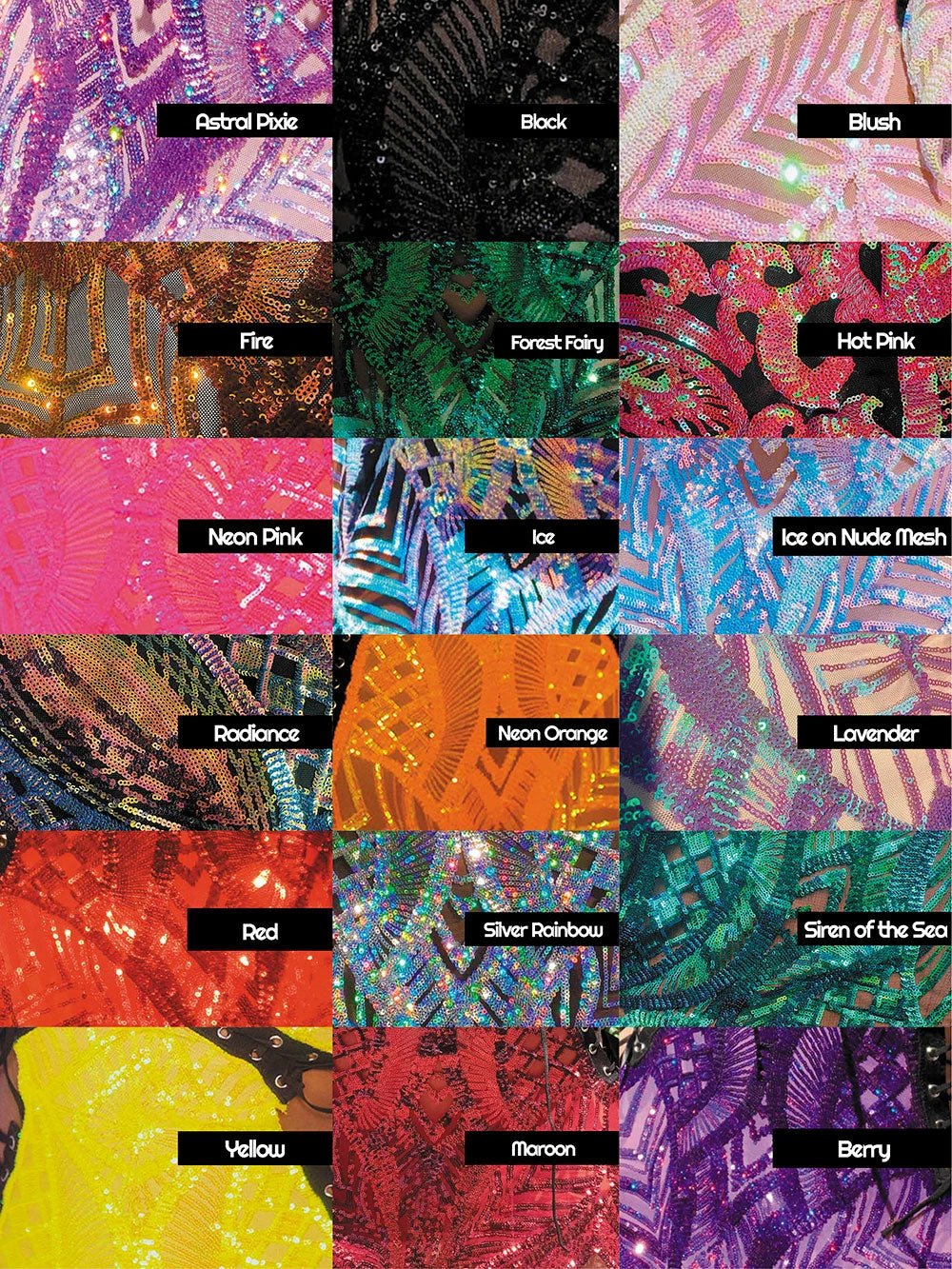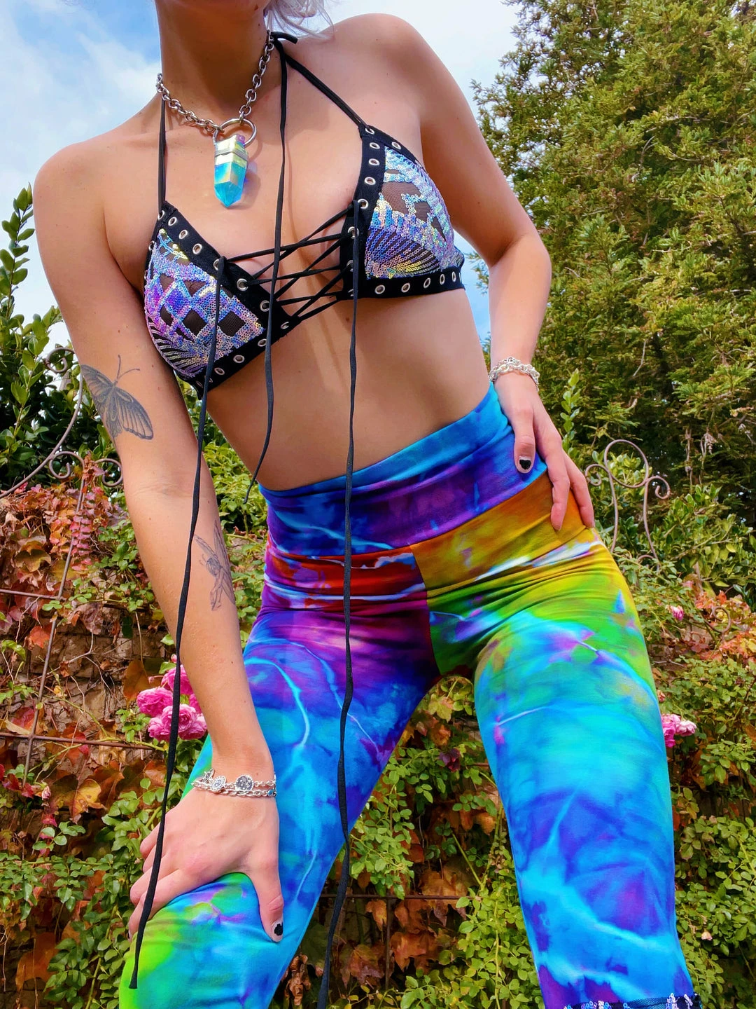Sequin on four way stretch mesh Disco Top with black grommets that lace up around back, neck & tie up across chest. Elastic string make this piece super adjustable and comfy. The lace can be tied in different ways, so if you are bustier you don’t necessarily have to tie her like a halter around your neck! WAHOO! 🙂 Sizes XL and up will have a dart for more bust support.