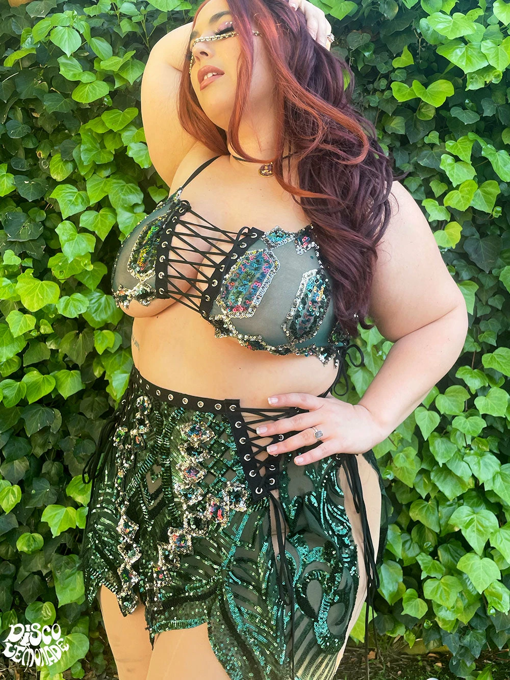 Forest green skirt with gold sequin diamond detailing & matching lace up emerald top.