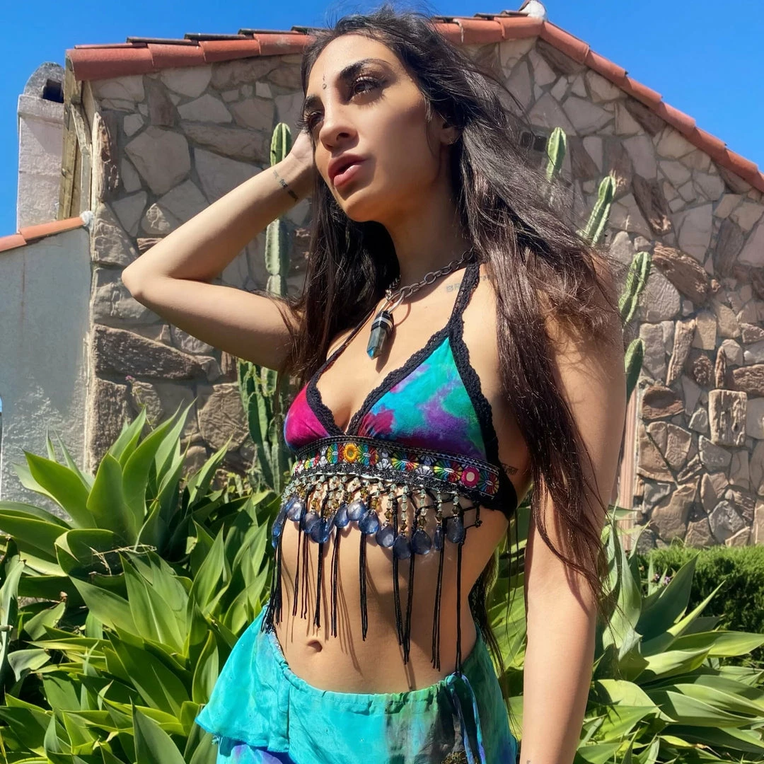 Recycled fabric from angel PSYdye {IG} ~ rainbow tie dye fabric with black lace detailing ~ rainbow trimming & thick blue & green crystal fringe ~ you will be G L O W I N G anywhere & everywhere you go in this colorful piece ~