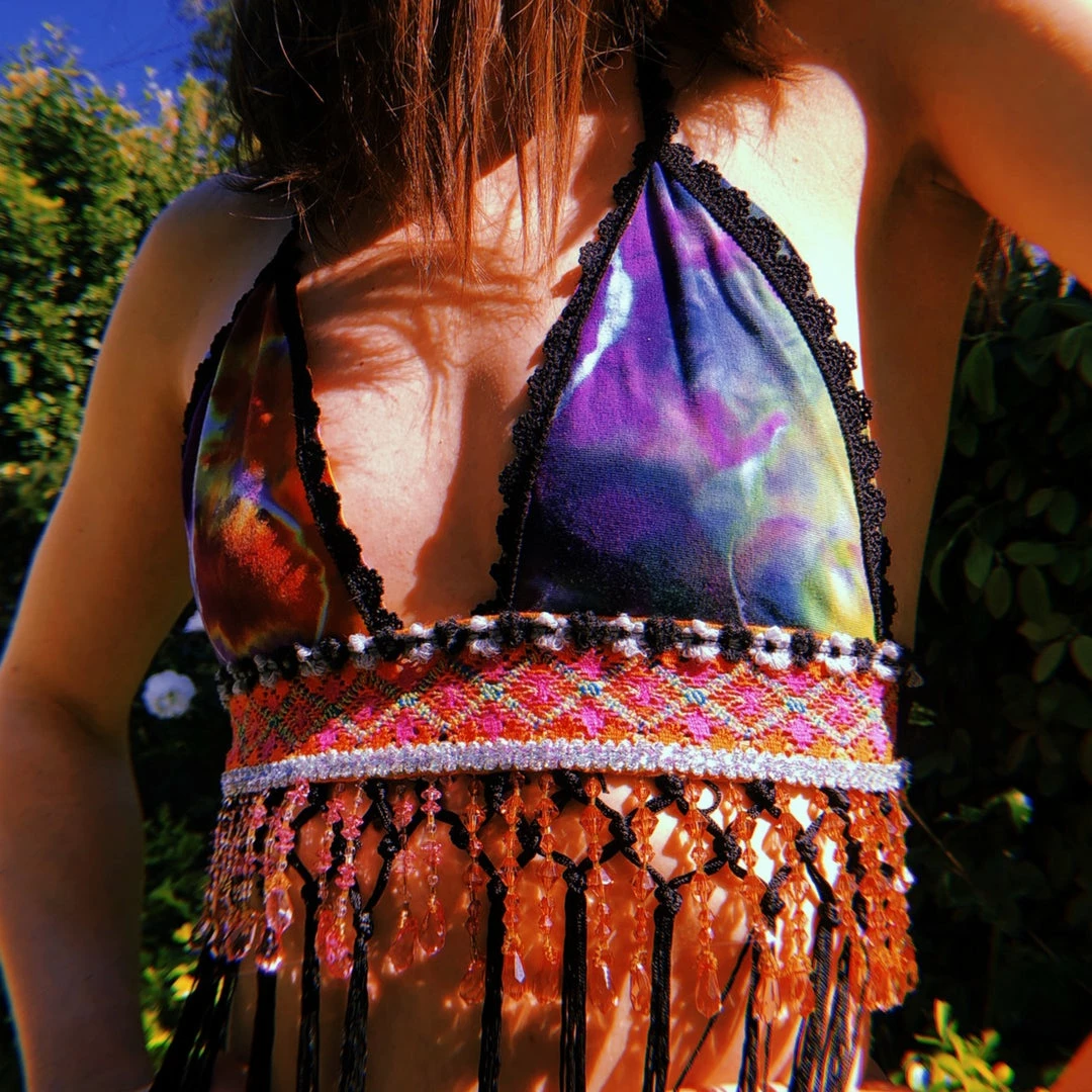 Recycled fabric from angel PSYdye {IG}~ the Lucid Disco Top is perfect for your next T R I P to another level of consciousness ~ Half orange and half pink beading layered on top of black fringe with three layers of trim sitting under the cup ~ this piece is dynamic & as colorful as them come 🙂 ✿✼:*゚