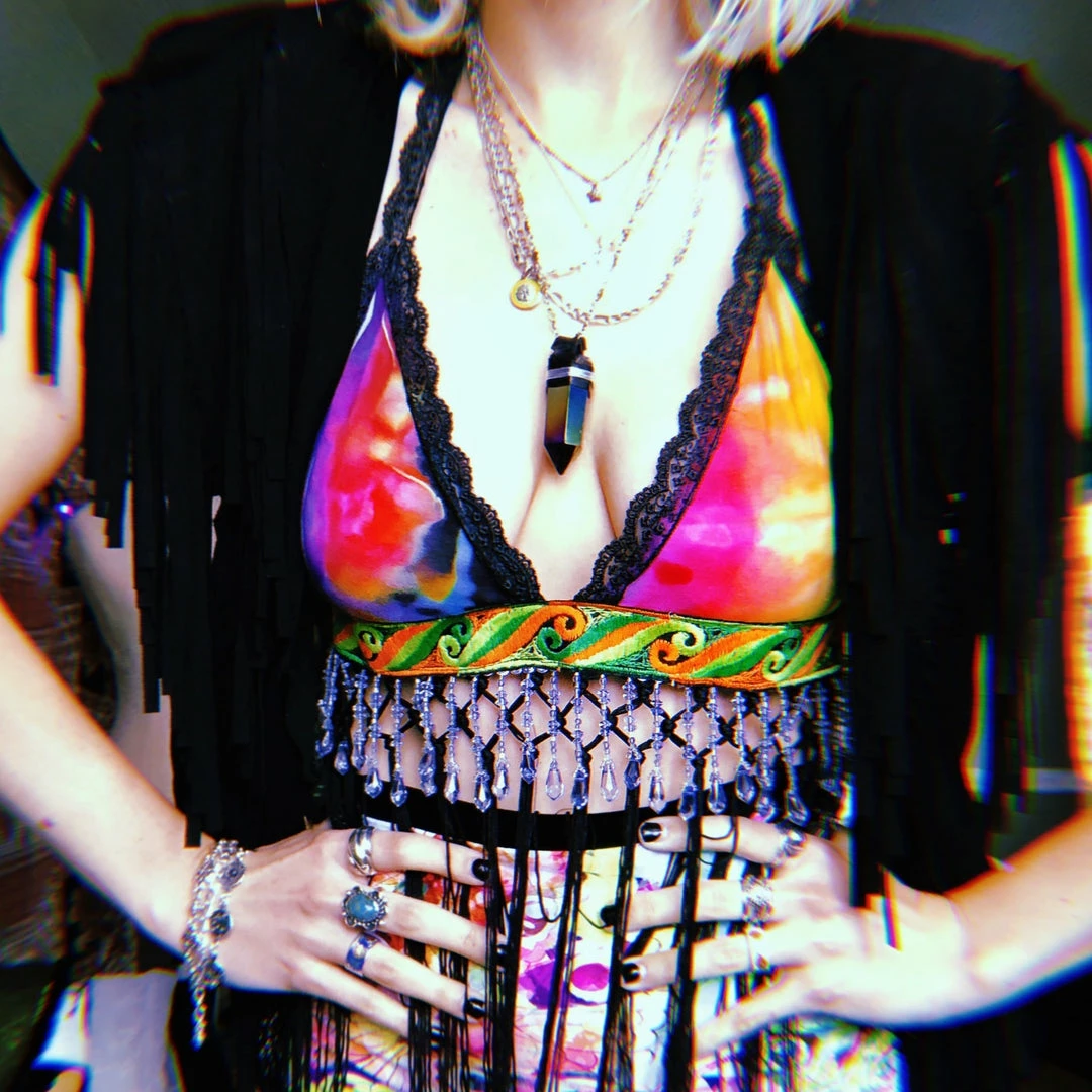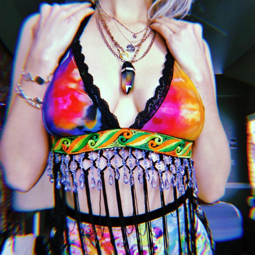 Recycled fabric from angel PSYdye {IG}~ the Lucy Disco Top is perfect for your next T R I P to another level of consciousness ~ Rainbow trim & blue beading ~ you will be G L O W I N G anywhere & everywhere you go in this colorful piece ~