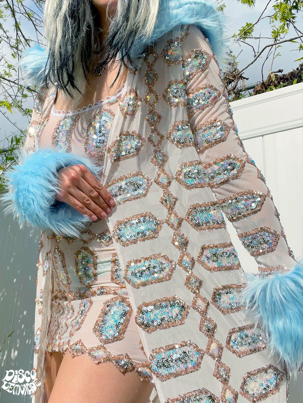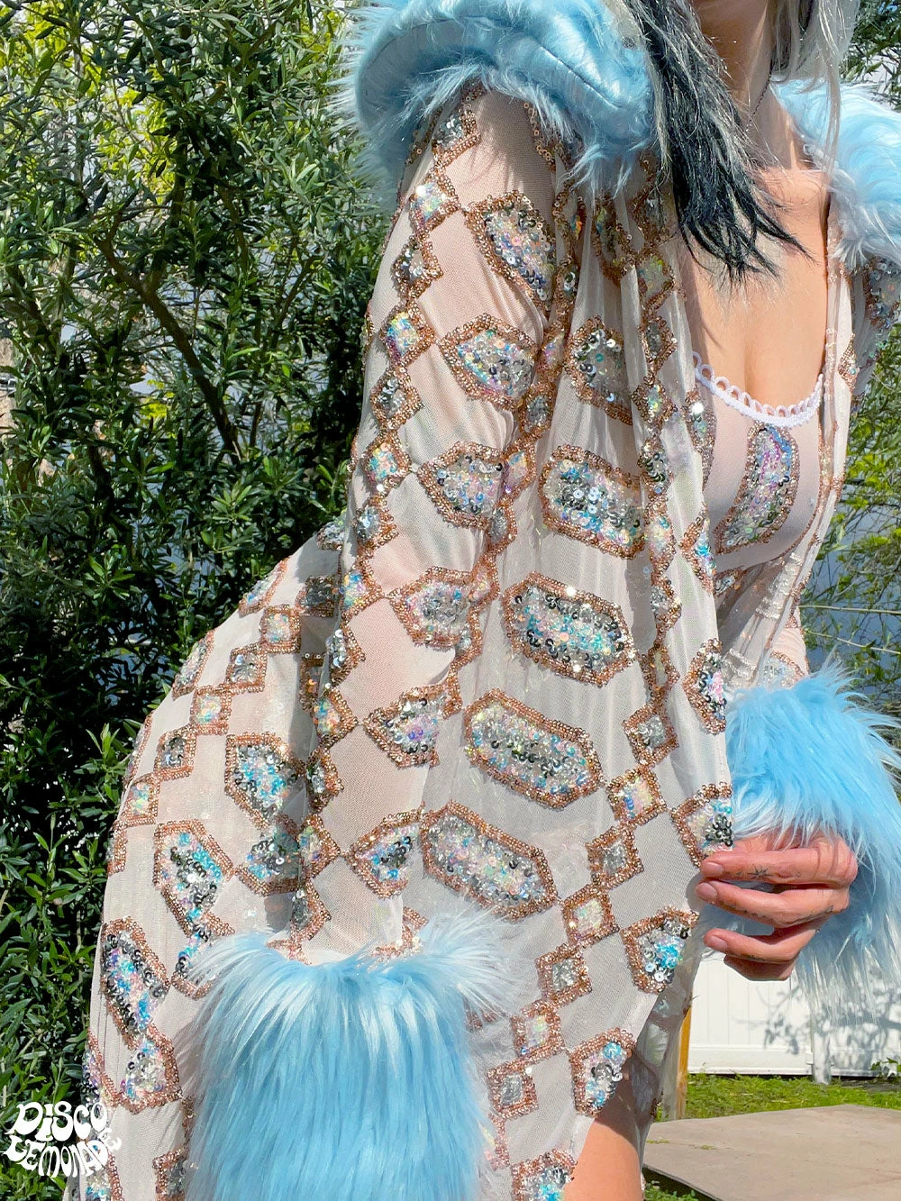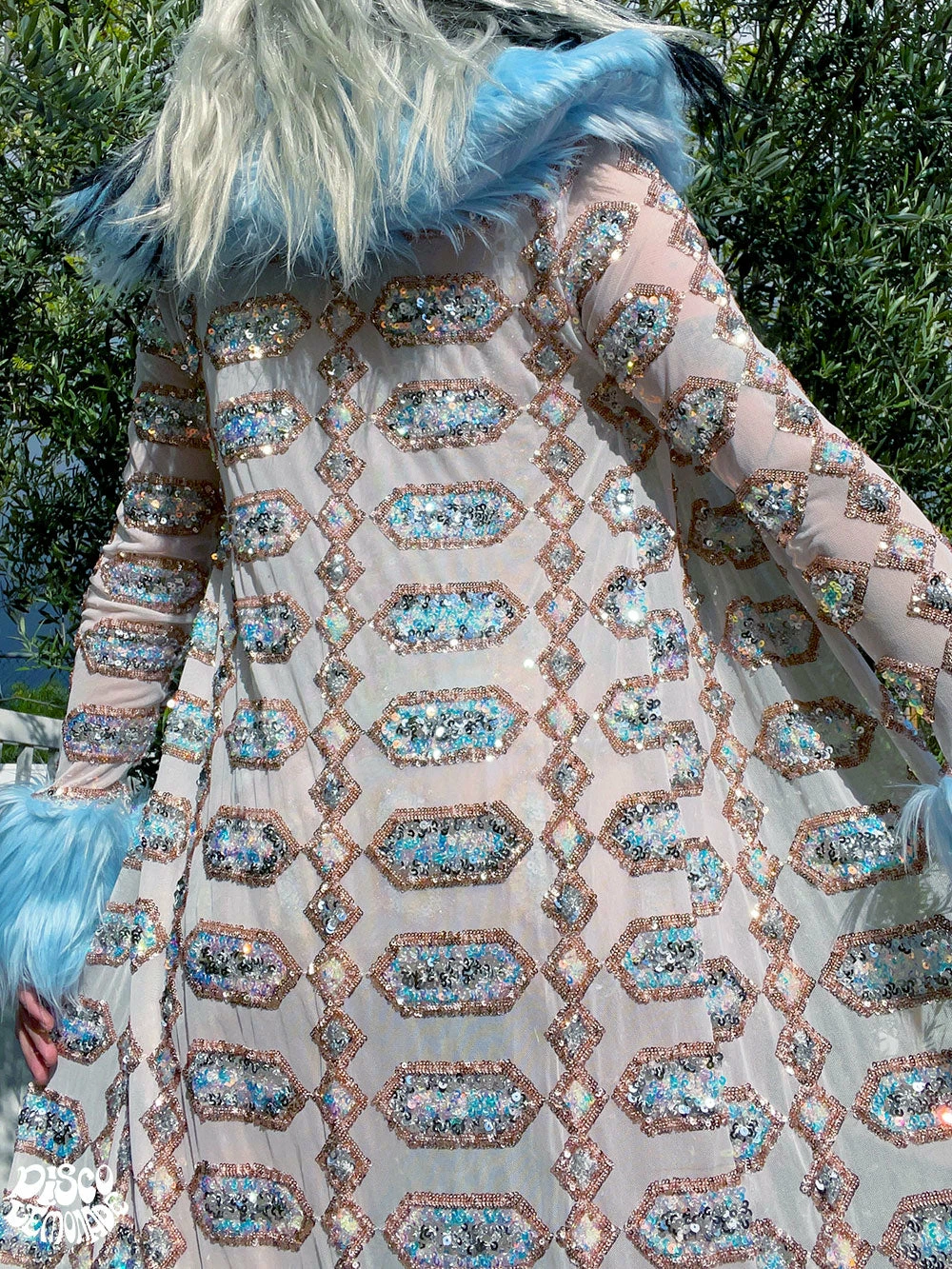 Our seductive sequin floor length duster is a MUST to layer over any cute Disco Lemonade dress, bells or cardigan to spice up your outfit.