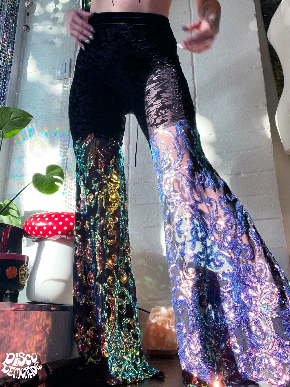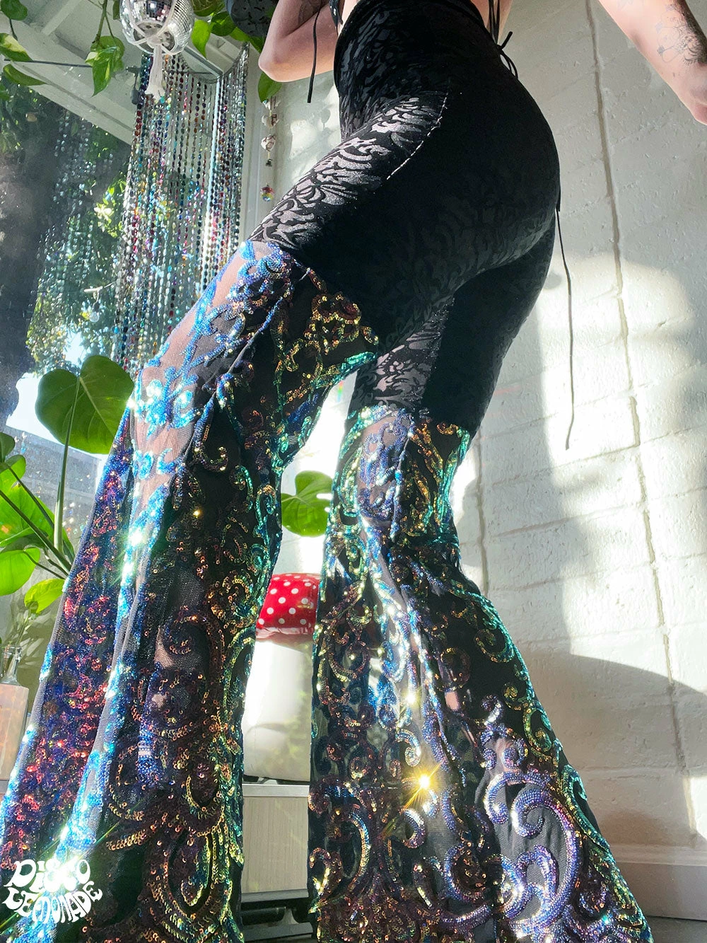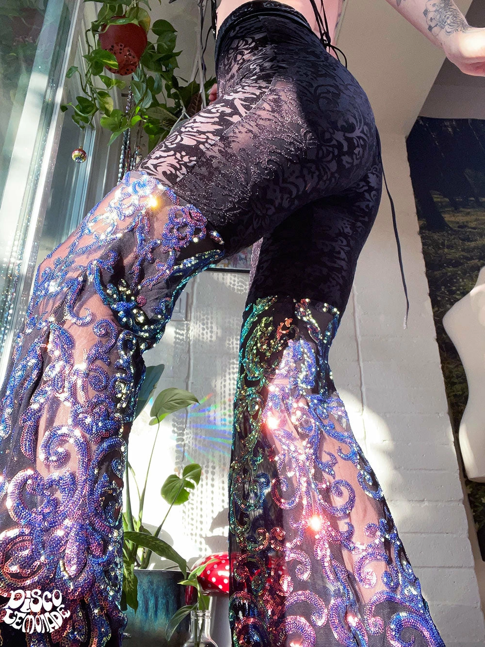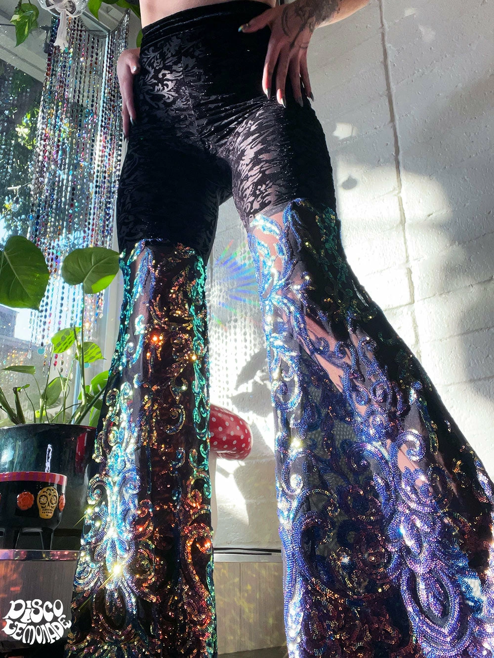 Burnout 4 way stretch velvet with sequin on 4 way stretch mesh bells.