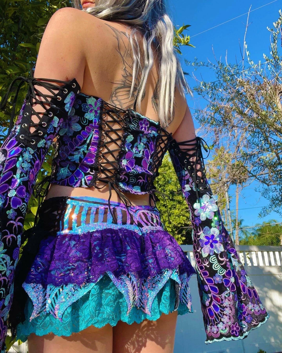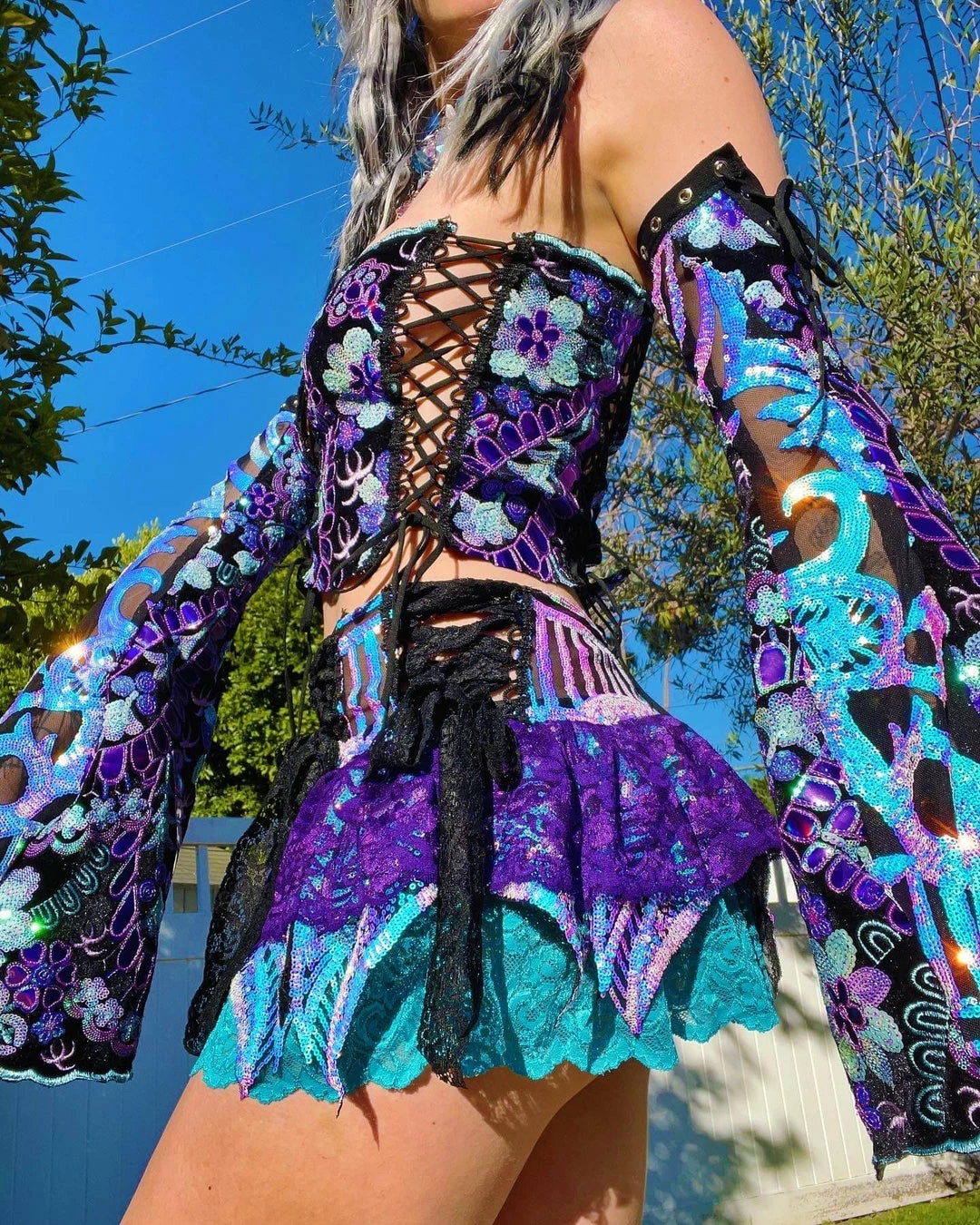 Paneled corset style top with ruffle detailing matching sequin turquoise and deep purple ruffle skirt and sequin & velvet patch worked bell sleeves to match.
