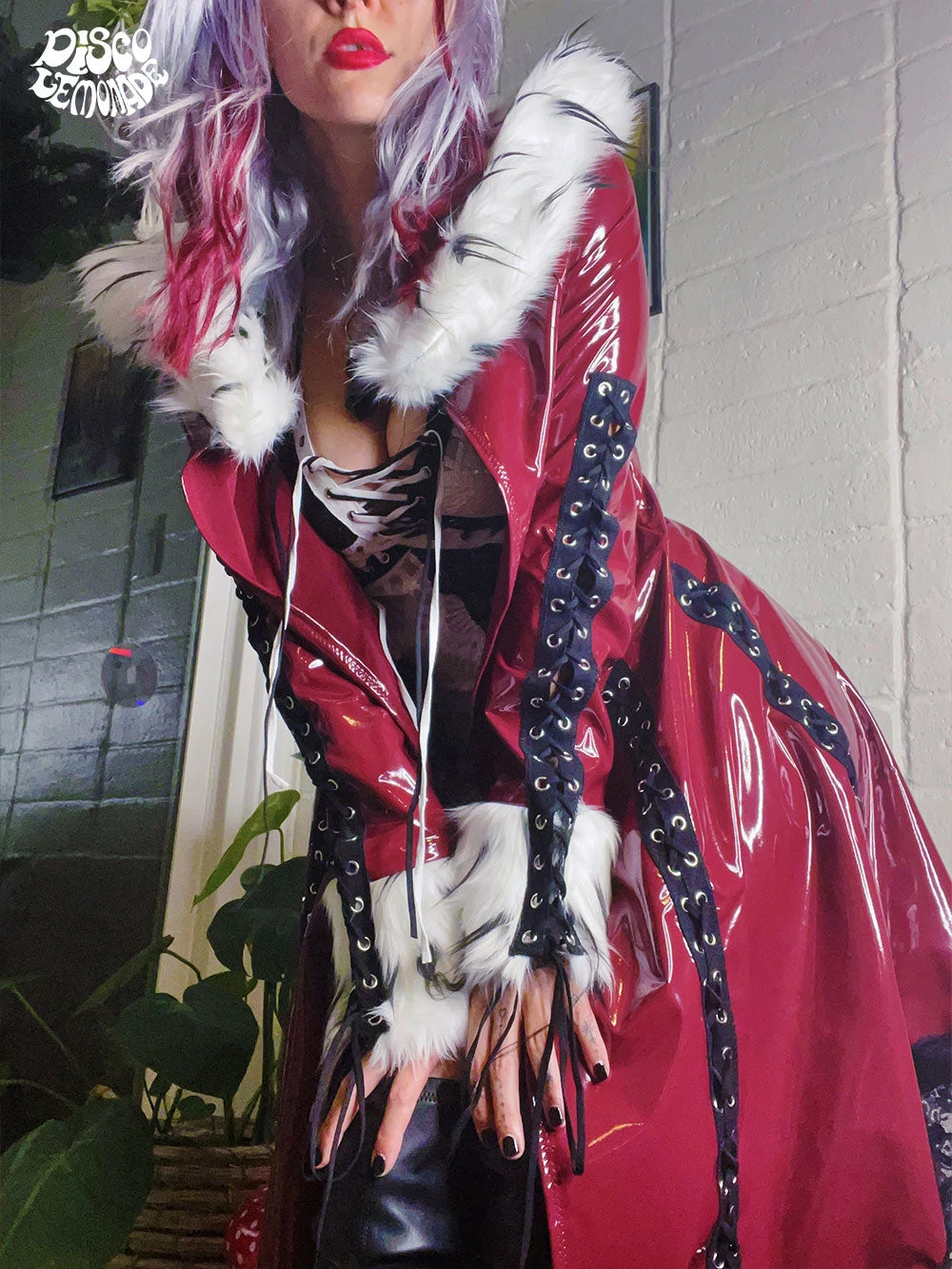 Faux latex with black lace up accents & a fur collar/cuffs.