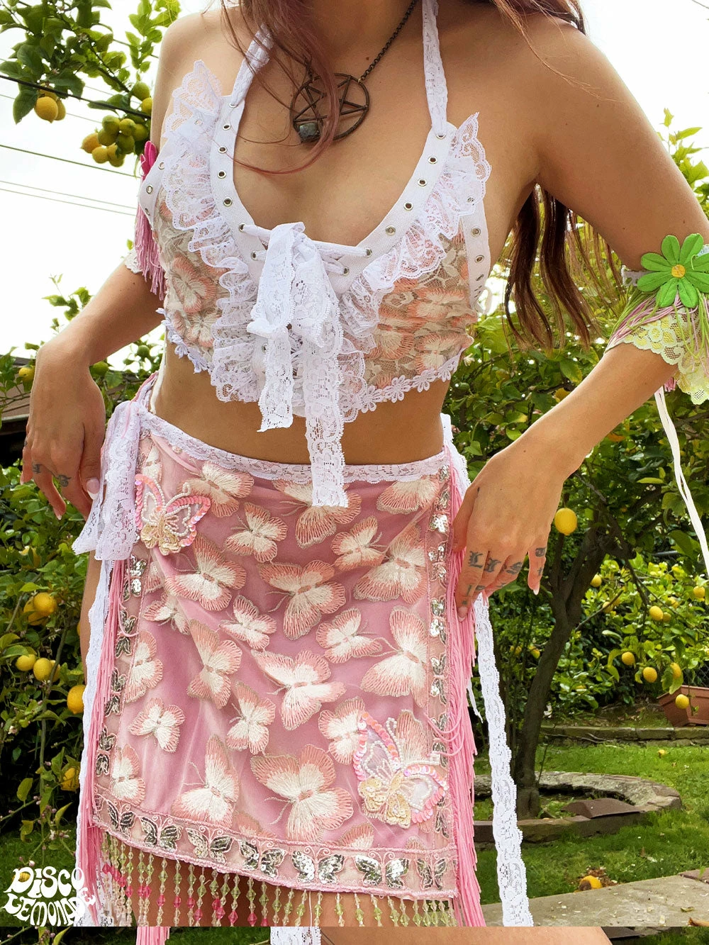 Butterfly mesh lace skirt with sequin butterfly sequin trim. Adorned with multi colored trim around the hem with pink fringe.