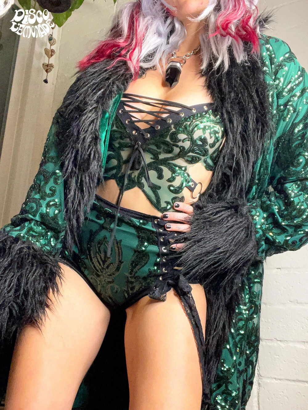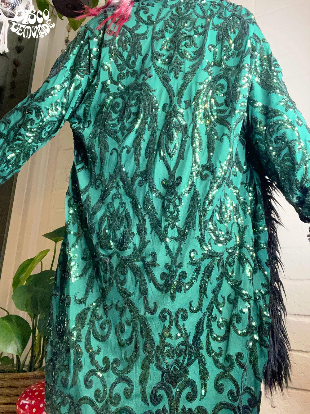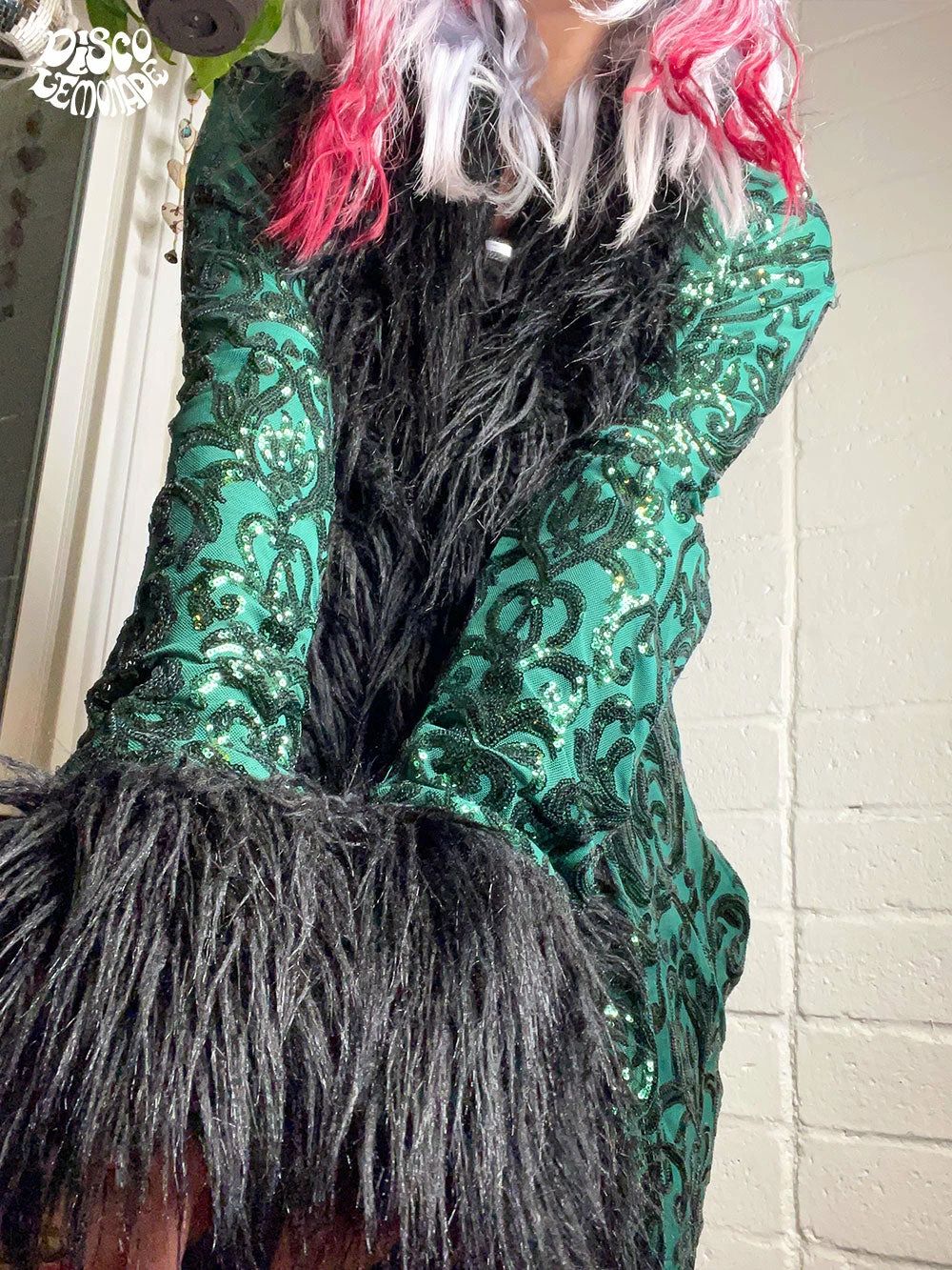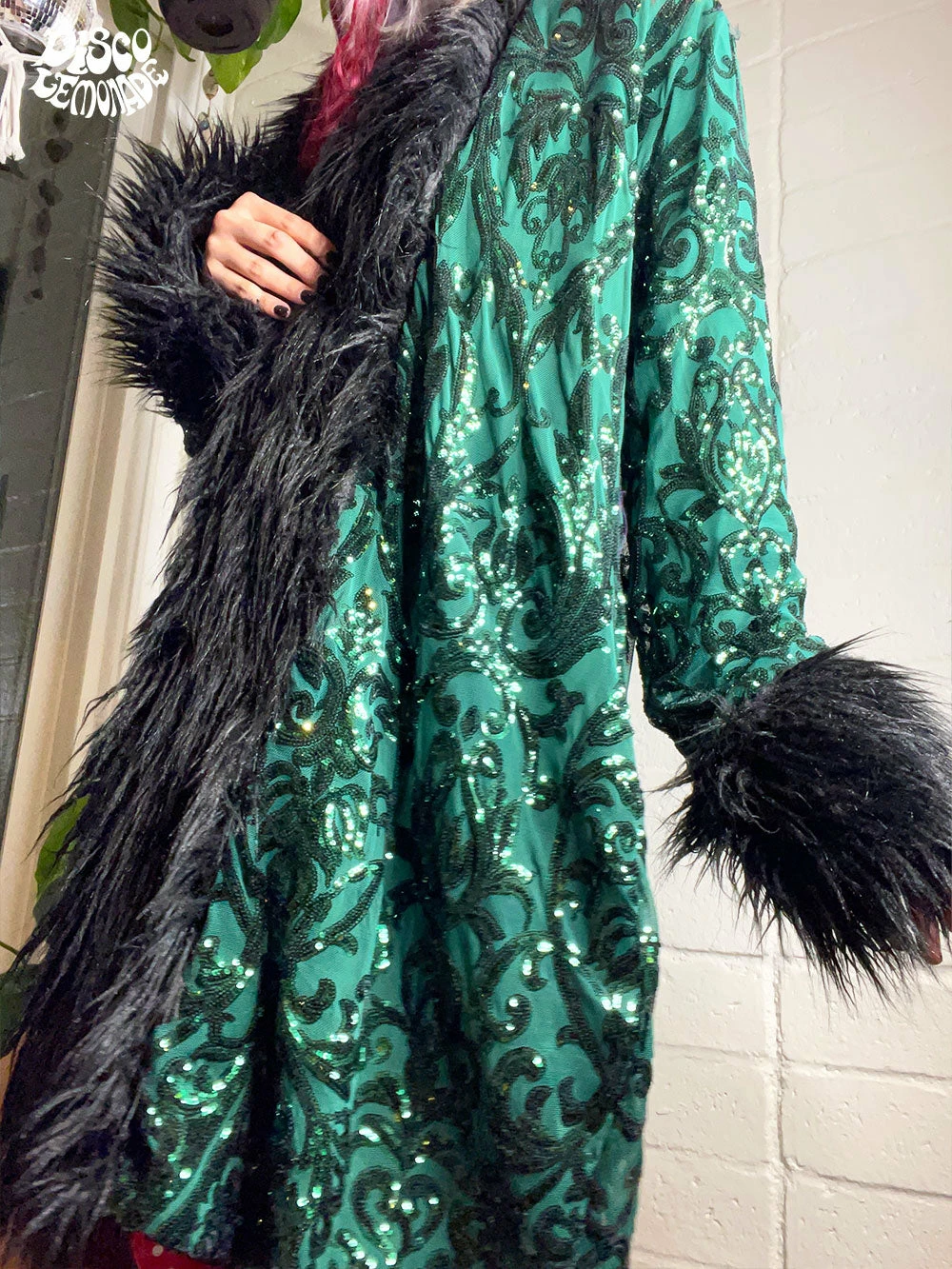 A coat of your disco daydreams ~ Oversized equin coat lined with velvet. With a faux fur collar and cuffs, she is the perfect coat for pretty much every day of your life.