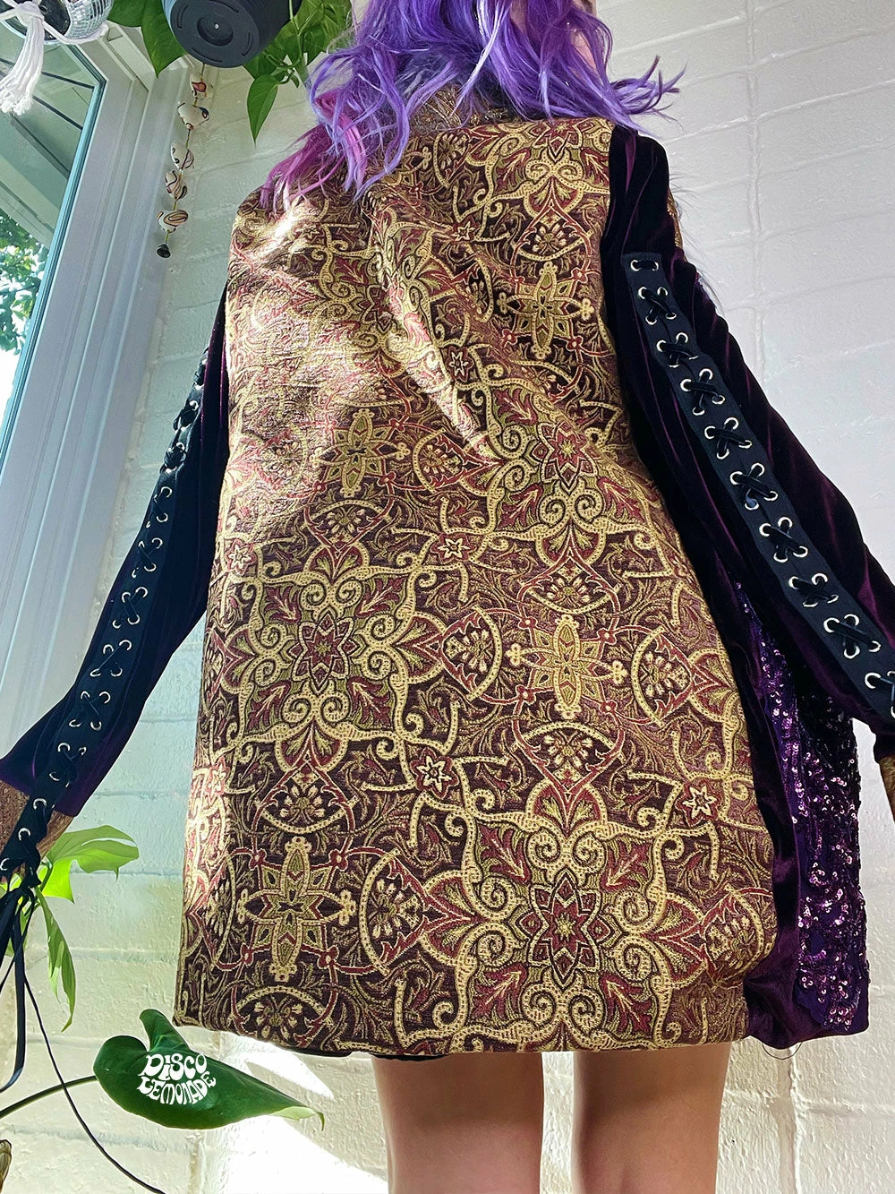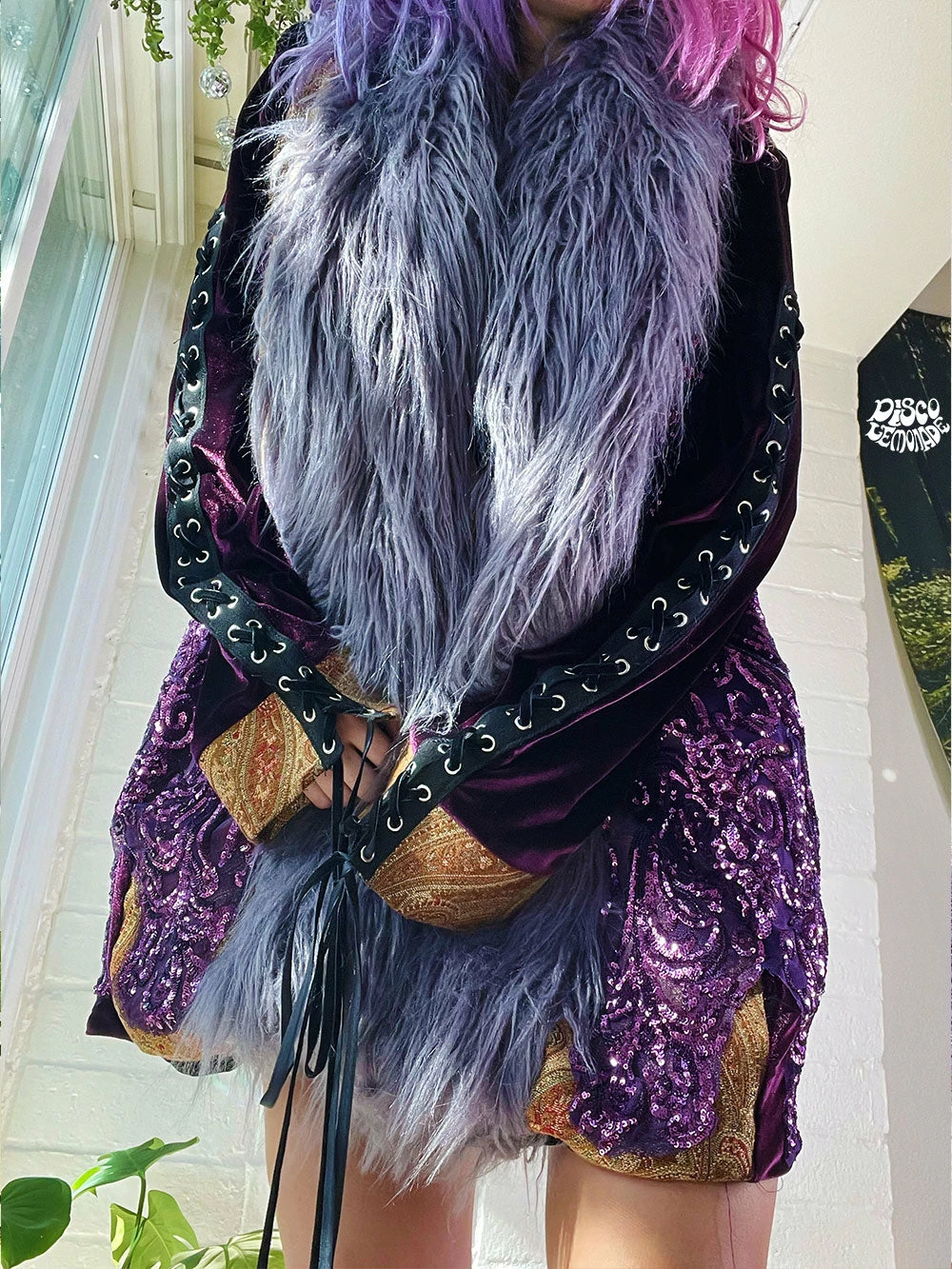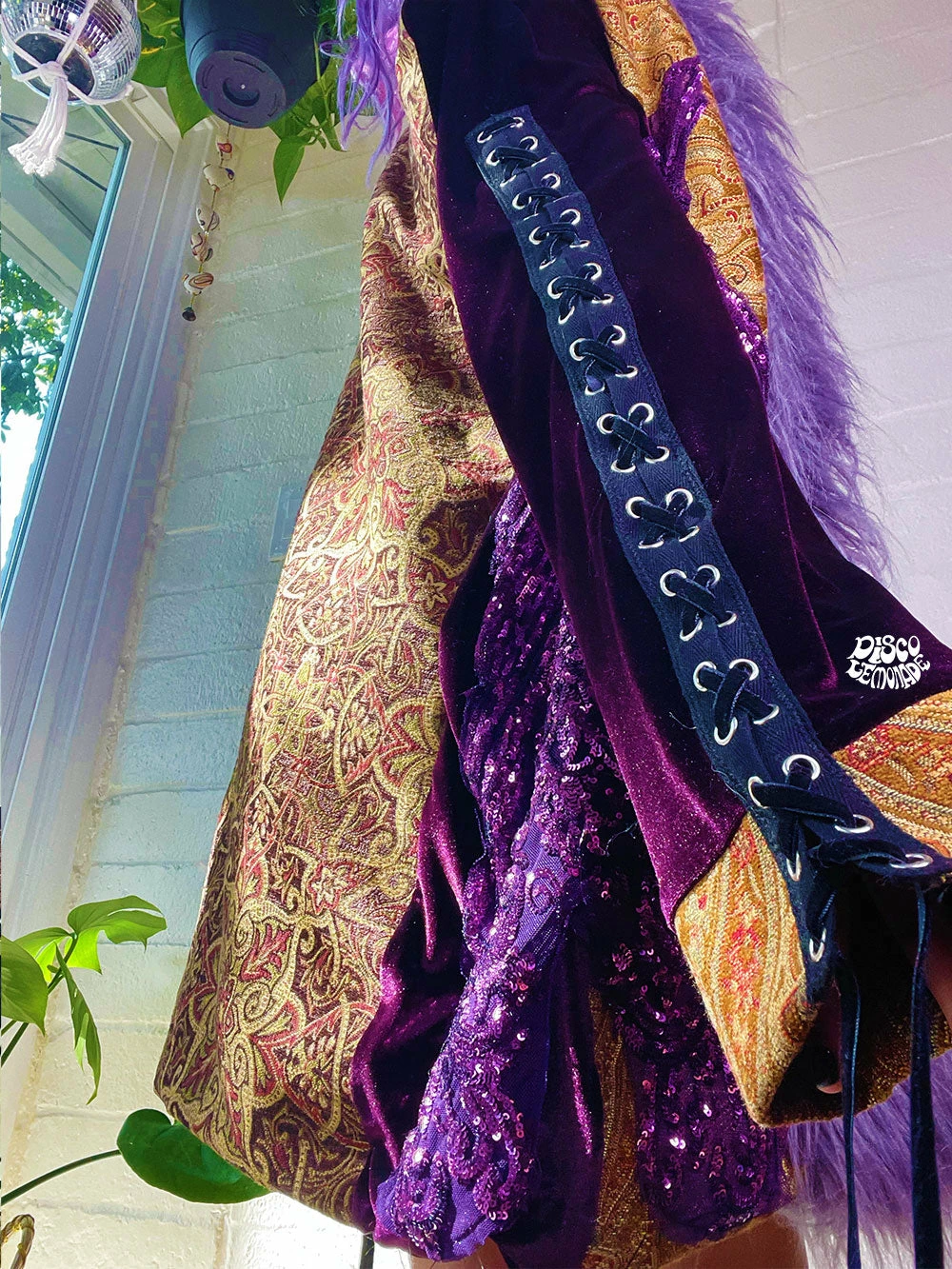 Matte Purple velvet fabric for the arms and lace up velvet straps. Please note the arm’s are single laye. This is to keep the lace up design laying down smoothly.Â