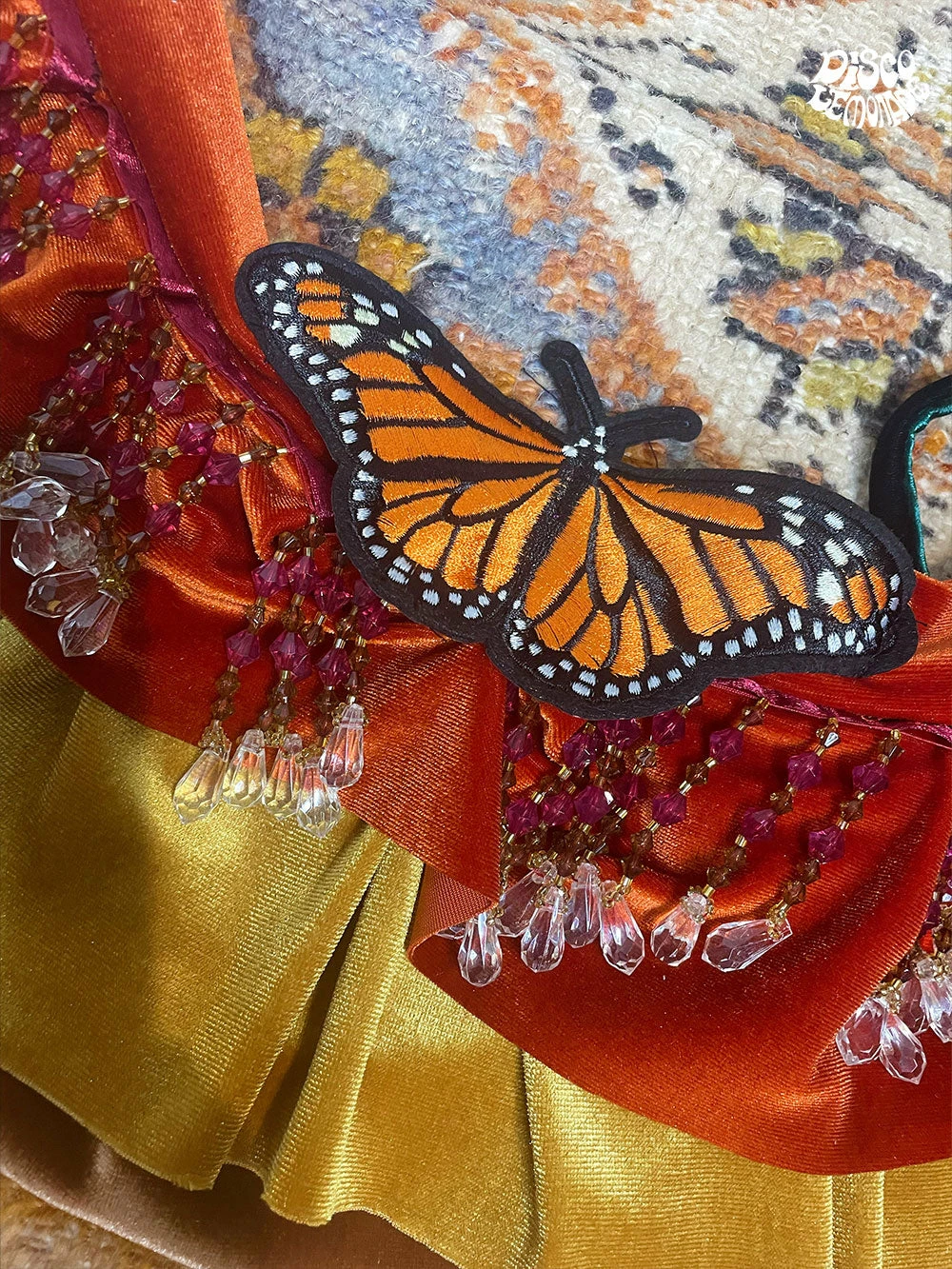 The cutest fairy bustle set that ever was. This set comes with a velvet halter top adjustable with velvet string & beaded butterfly embellishments, velvet bustle with beaded trimming & butterfly patch & high waisted velvet ace up shorts.
