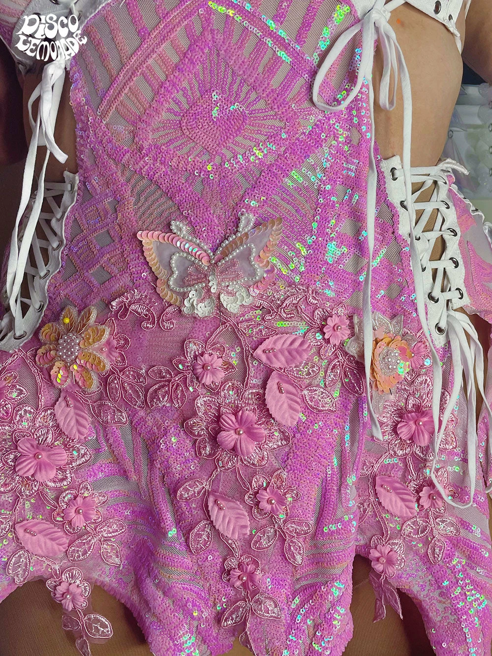 Baby pink iridescent sequin on 4 way stretch mess with pink sequin embellishments & hand beaded flower patches.