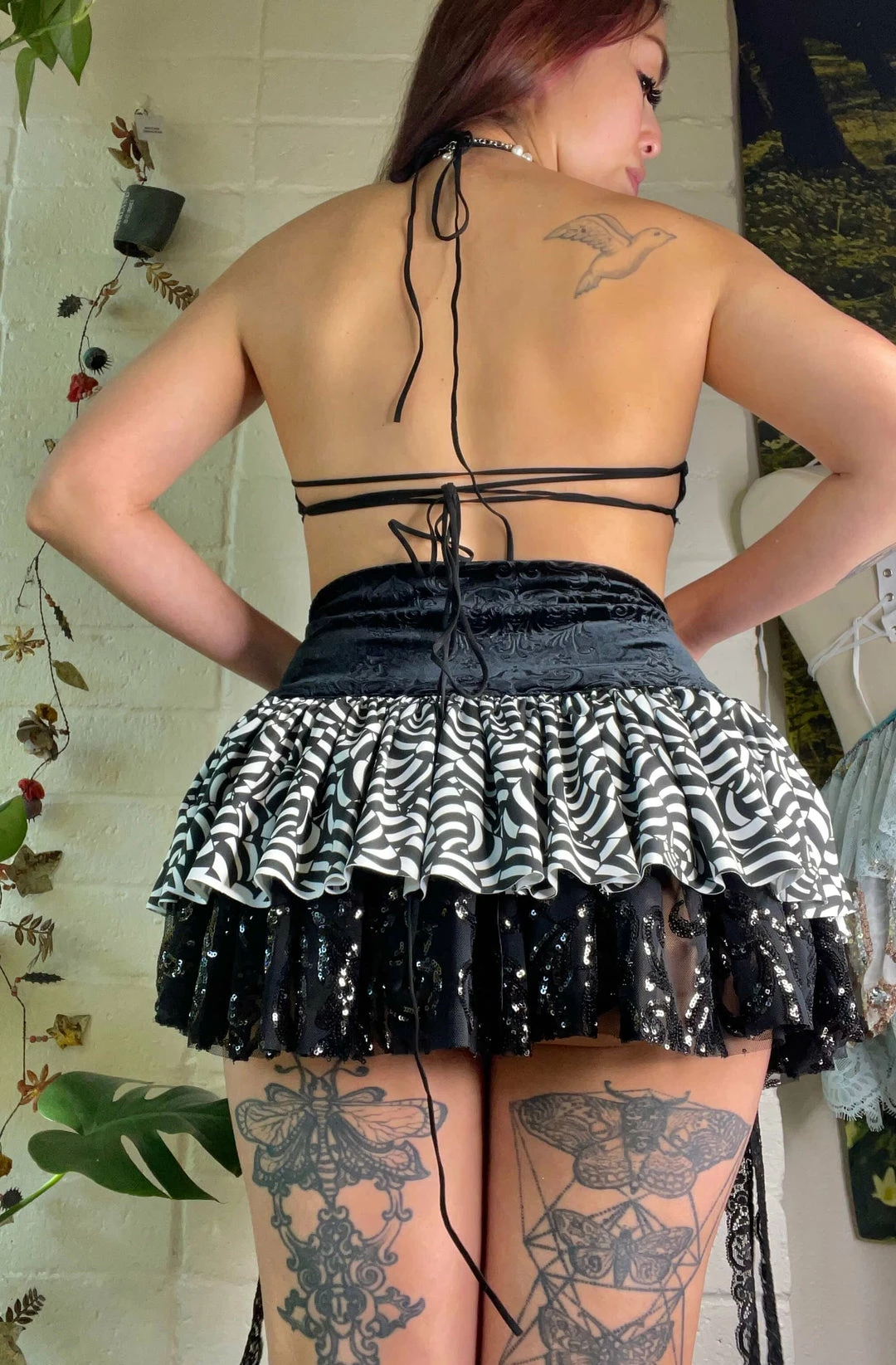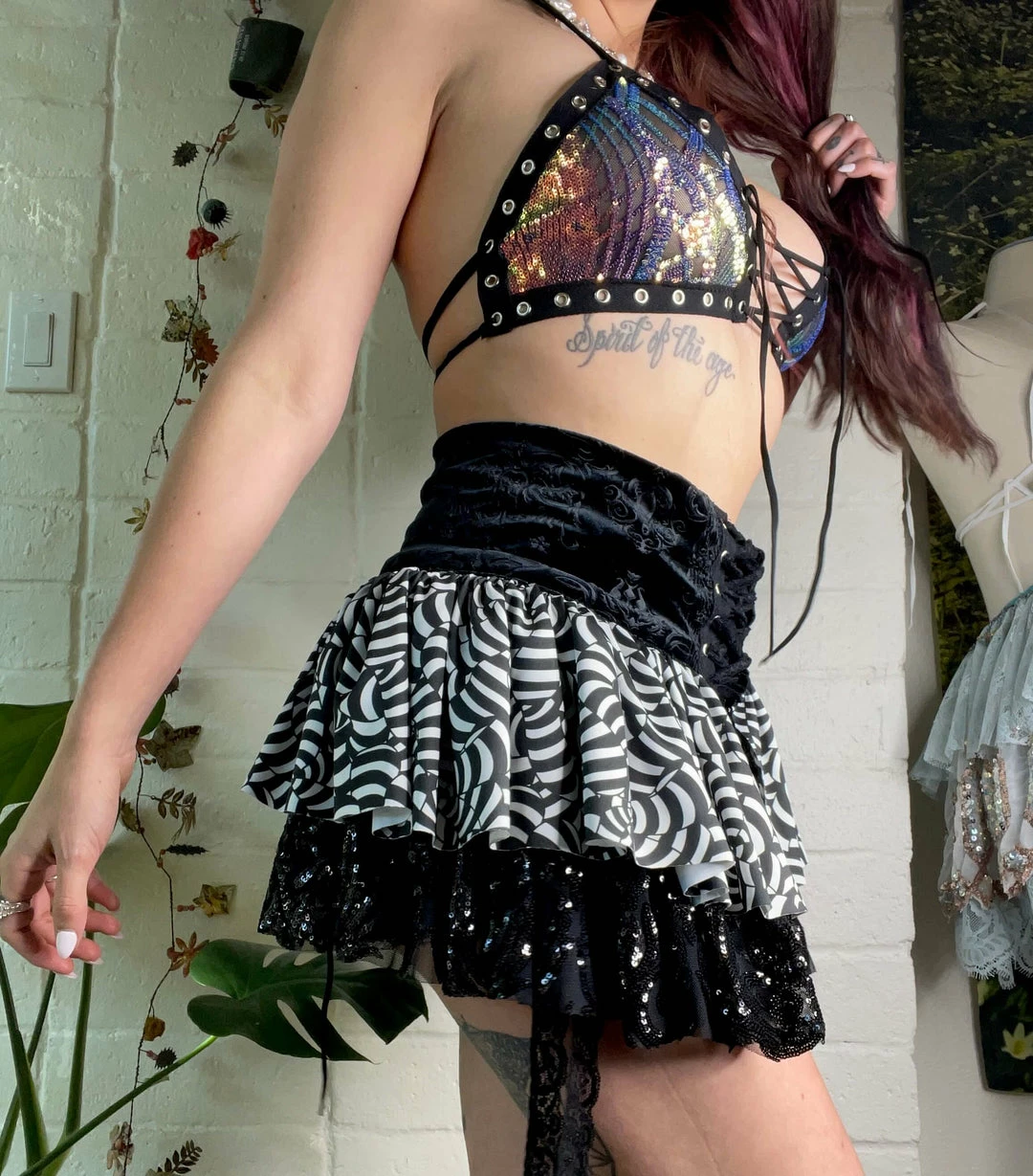 Radiance lace up top with bustle skirt and Ego Death black sequin shorts.