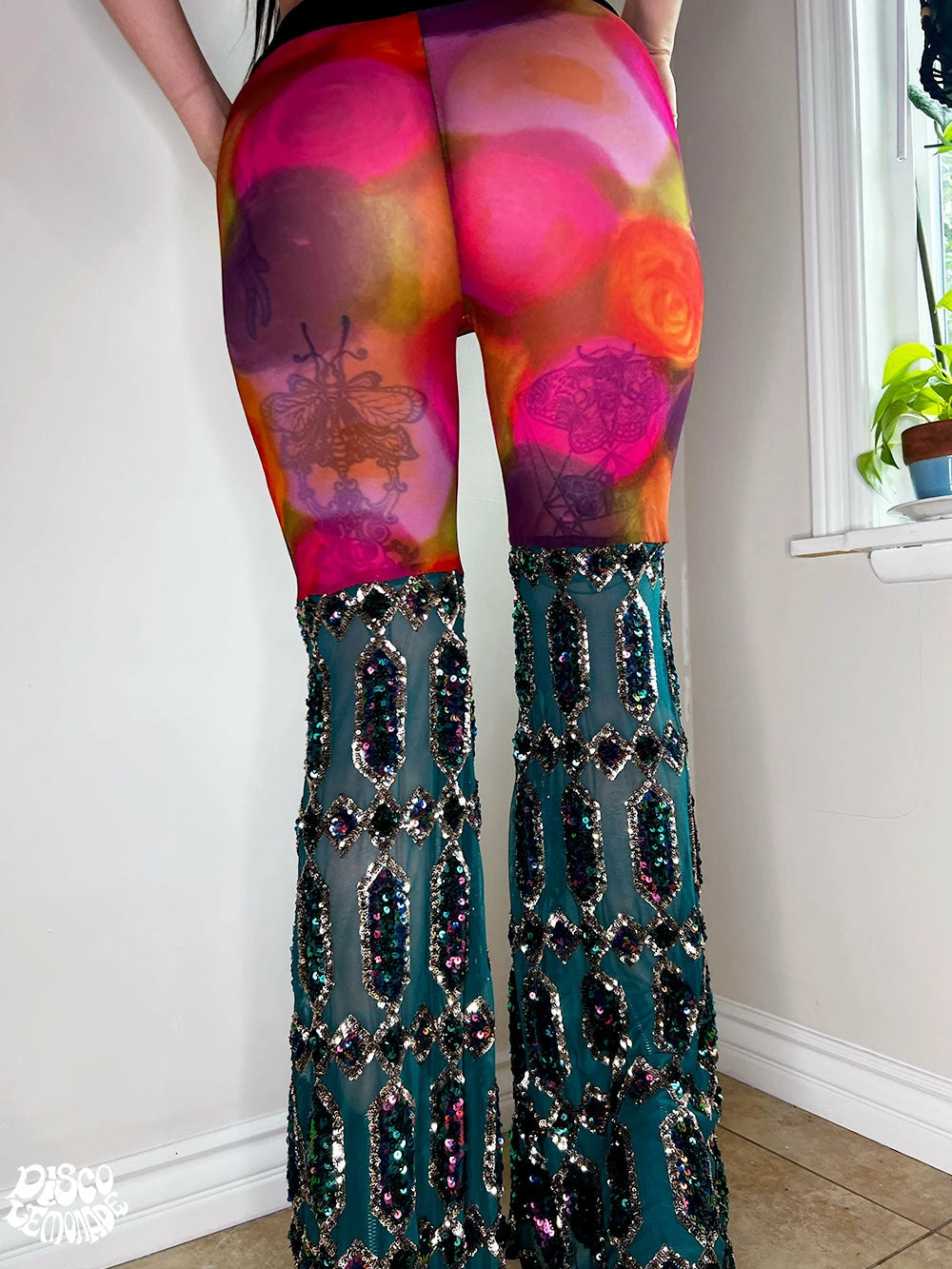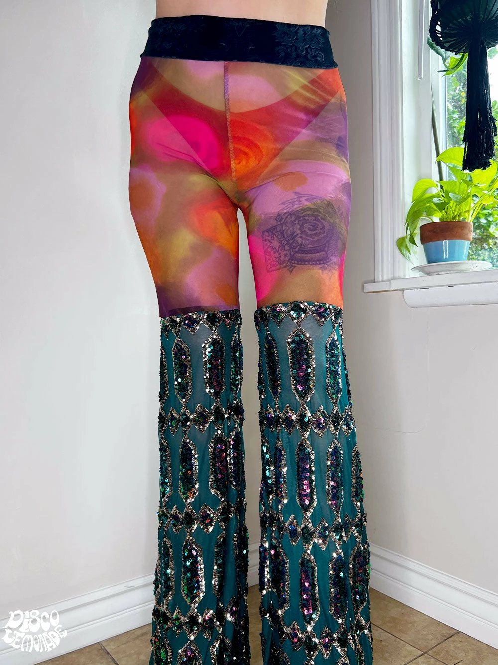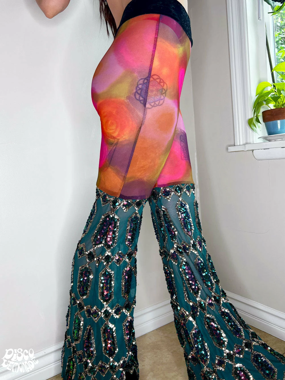 Rose mesh with emerald sequin on 4 way stretch mesh bell bottoms.