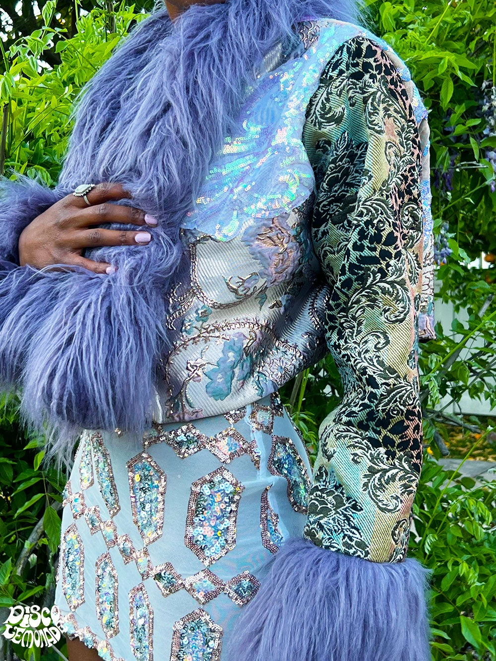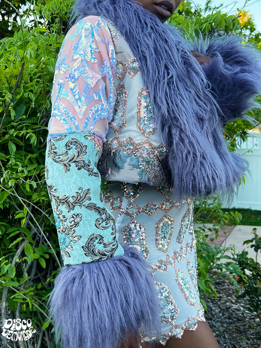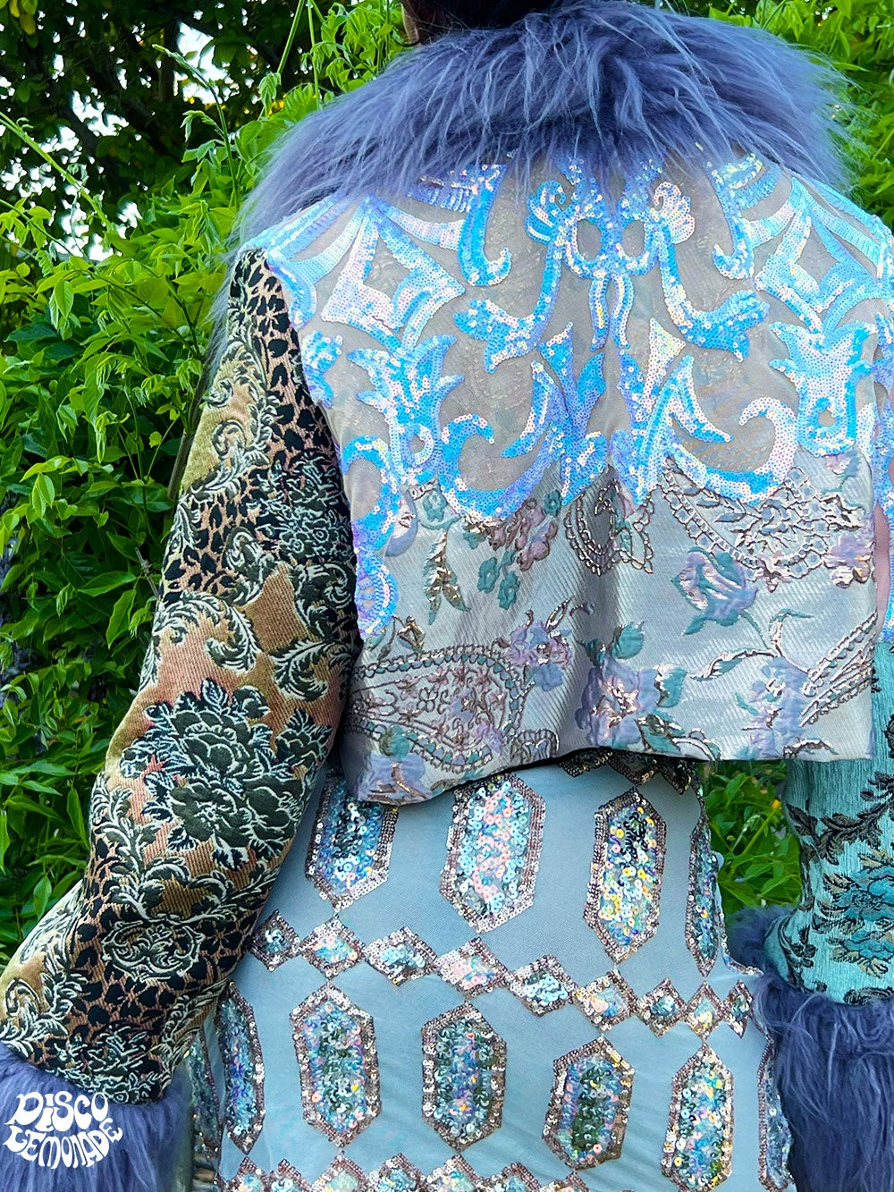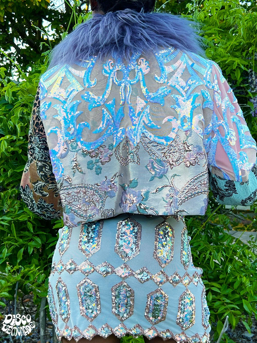 Pastel upholstery & sequin cropped coat.