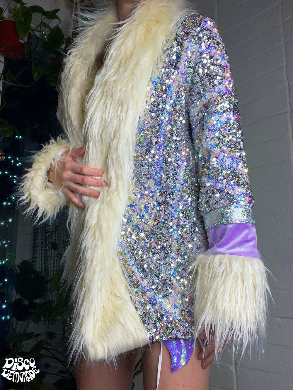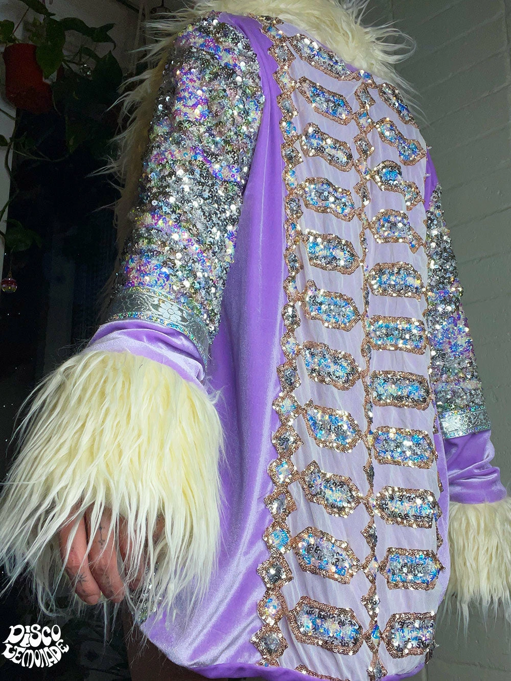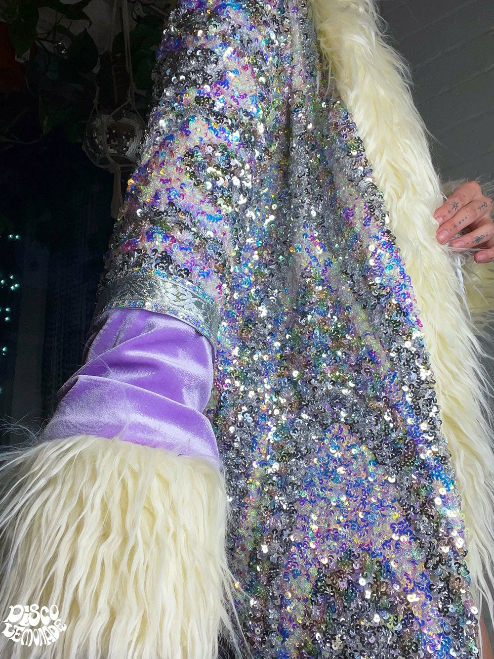 Swirly sequin fabric in iridescent colors for the sides and sleeves.