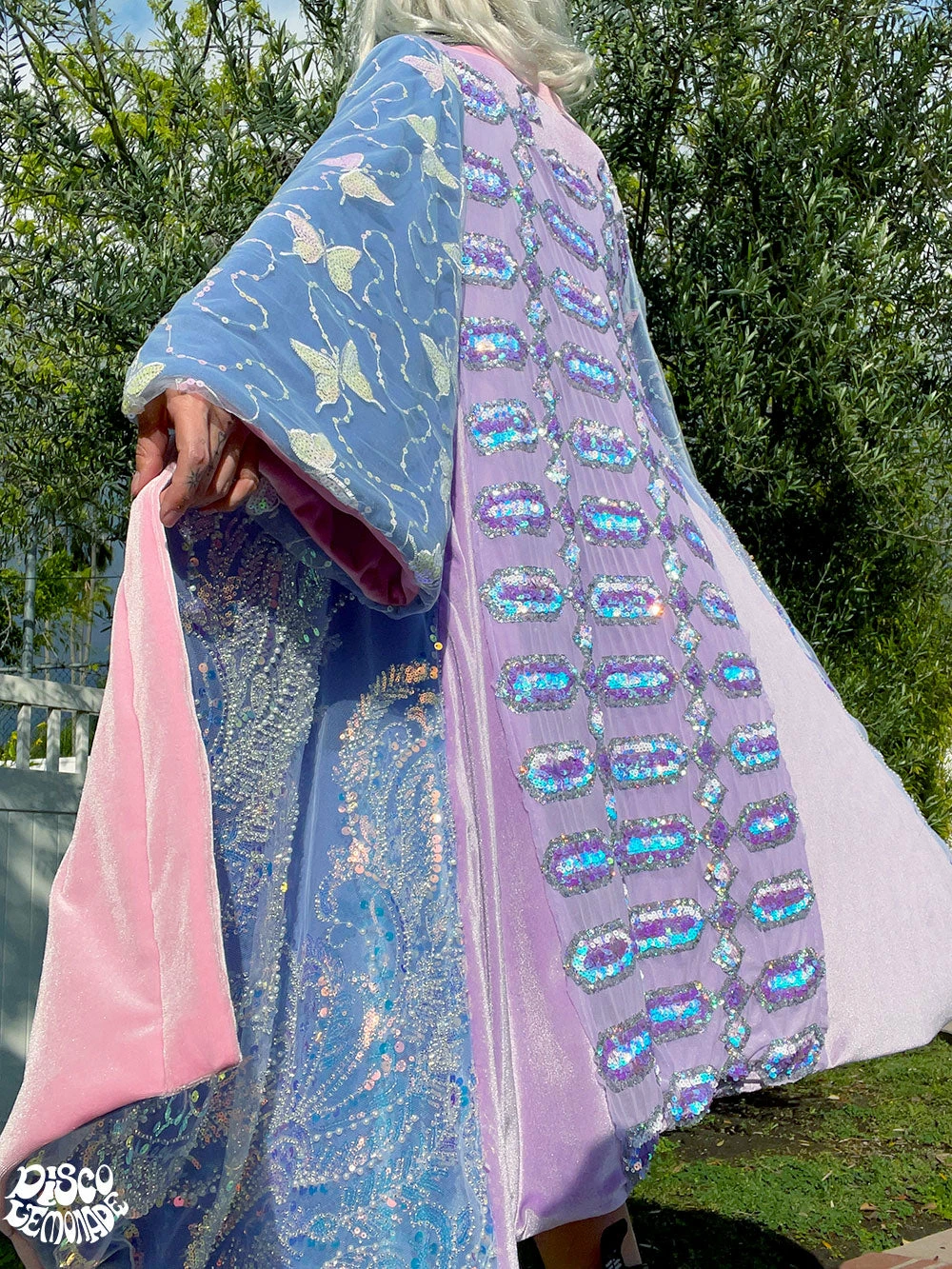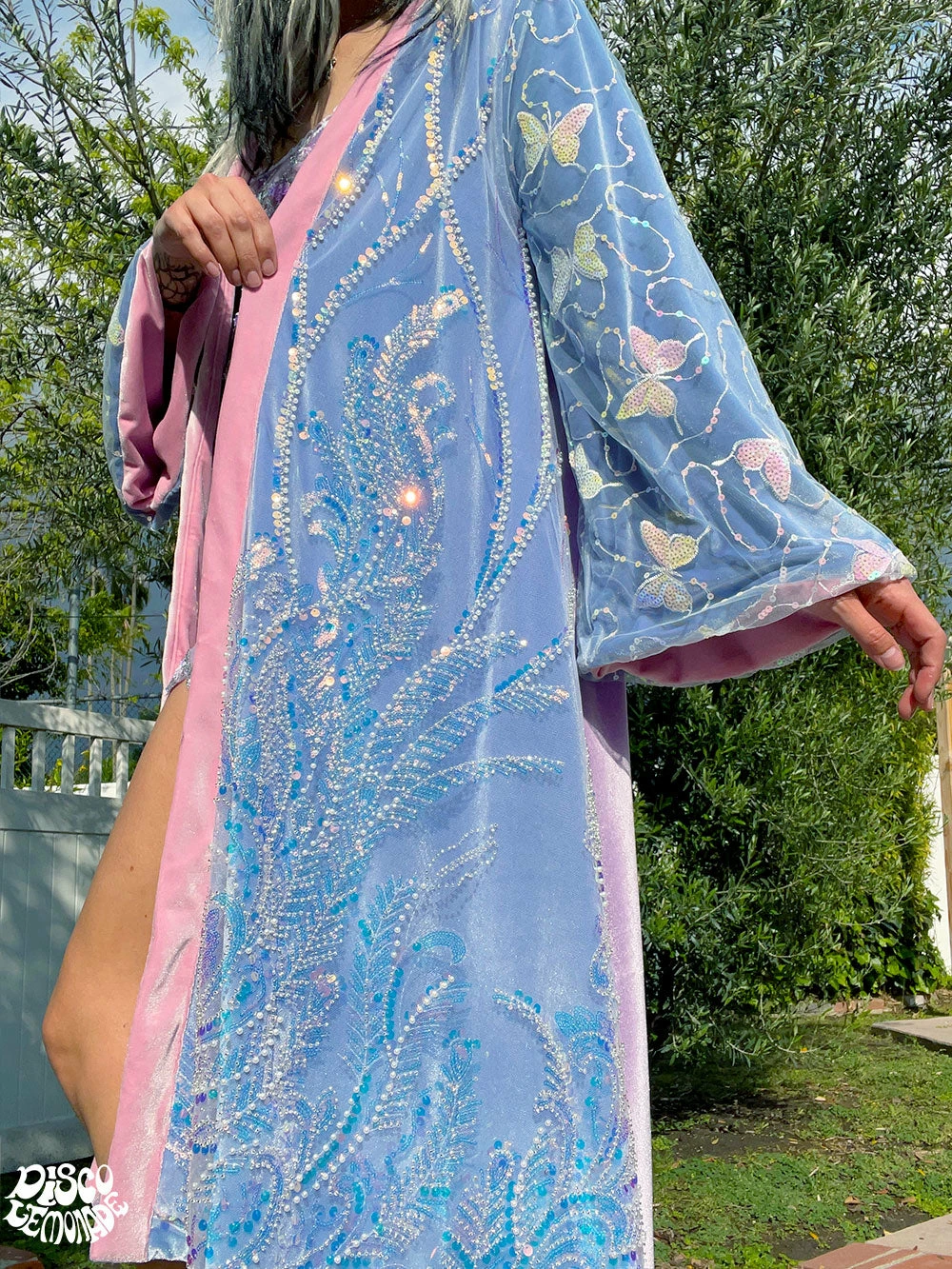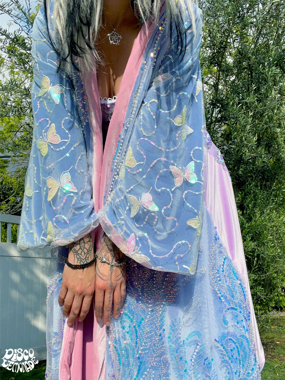 Hand beaded sequin fabric with velvet lining, sequin butterfly & lavender velvet with Vanishing Fae sequin detail. Floor Length.