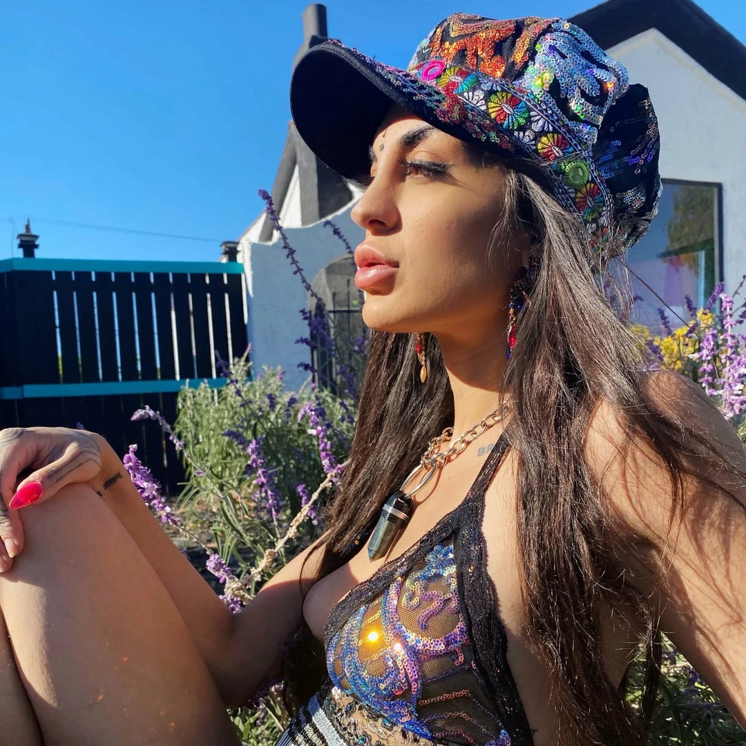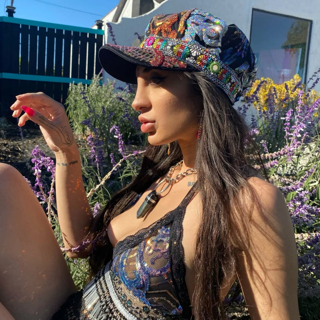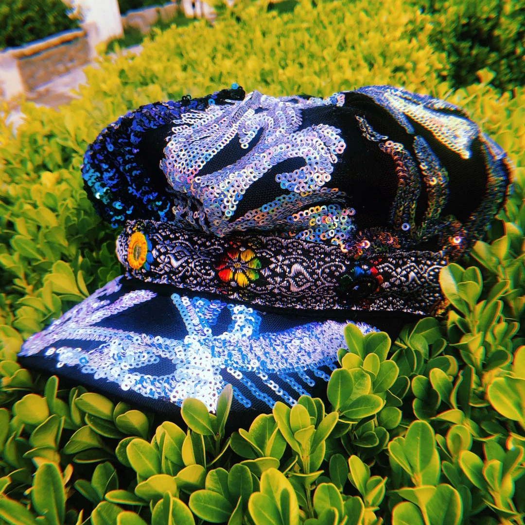 Decked out messenger hat ~ different sequin sewn on around the top & gorgeous bohemian trimming along the bottom with a sequin covered brim ~ elastic band in back so it fits a variety of head shapes! woo!