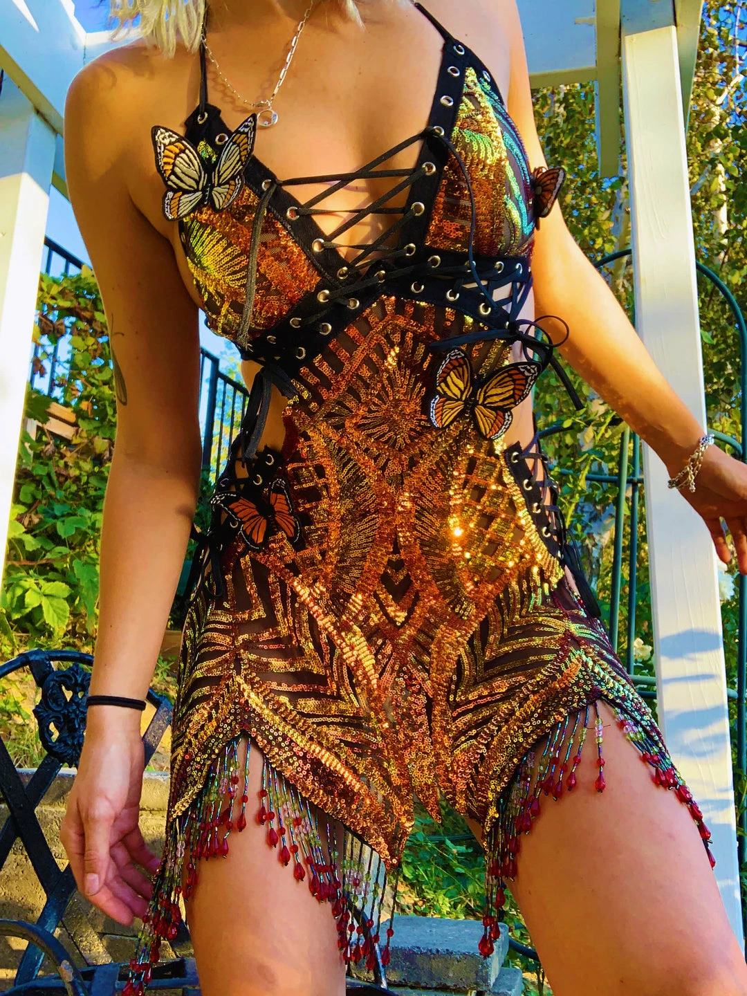 Orange iridescent sequin tinker style Disco Dress with butterfly embellishments and beading along the hem. Beading trim may vary upon stock. Each piece is made to order and will vary slightly in butterfly embellishments.