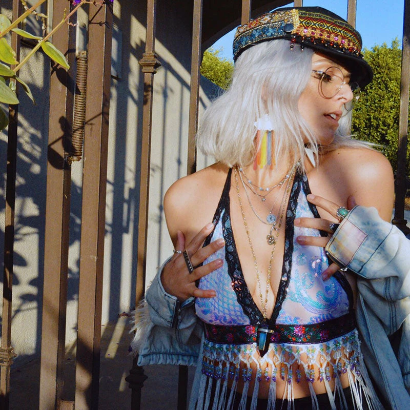 Inspired by a beautiful moonstone gem ~ the Moonstone Disco Top is truly a magical piece ~ White fringe, decorated beading, bohemian trim & black lace complete the perfect top for any outfit ~