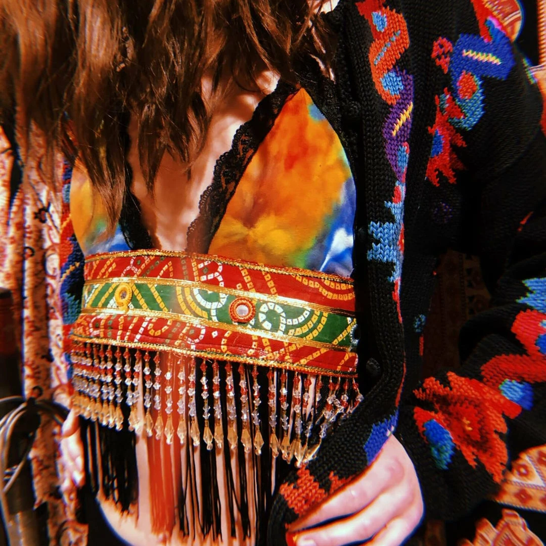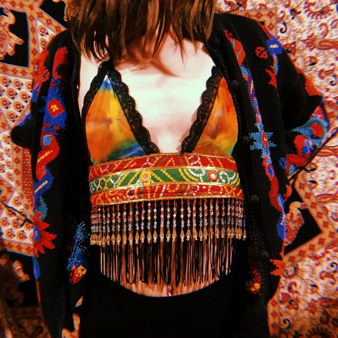 Recycled fabric from angel PSYdye {IG}~ the Morocco Disco Top is perfect for your next T R I P to another level of consciousness ~ Greens, reds & yellows on a thick band with gorgeous yellow & red crystals dangling on top black fringe ~ you will be G L O W I N G anywhere & everywhere you go in this colorful piece ~