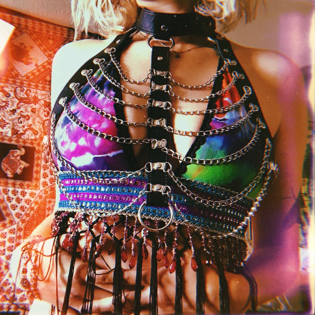 Recycled fabric from angel PSYdye {IG}~ the Motley Disco Top is perfect for your next T R I P to another level of consciousness ~ Purple, green, blue & orange tie dye, black fringe, maroon beading and a thick purple & turquoise band sitting under the cups, this Disco Top is a trippy sensation ✿✼:*゚