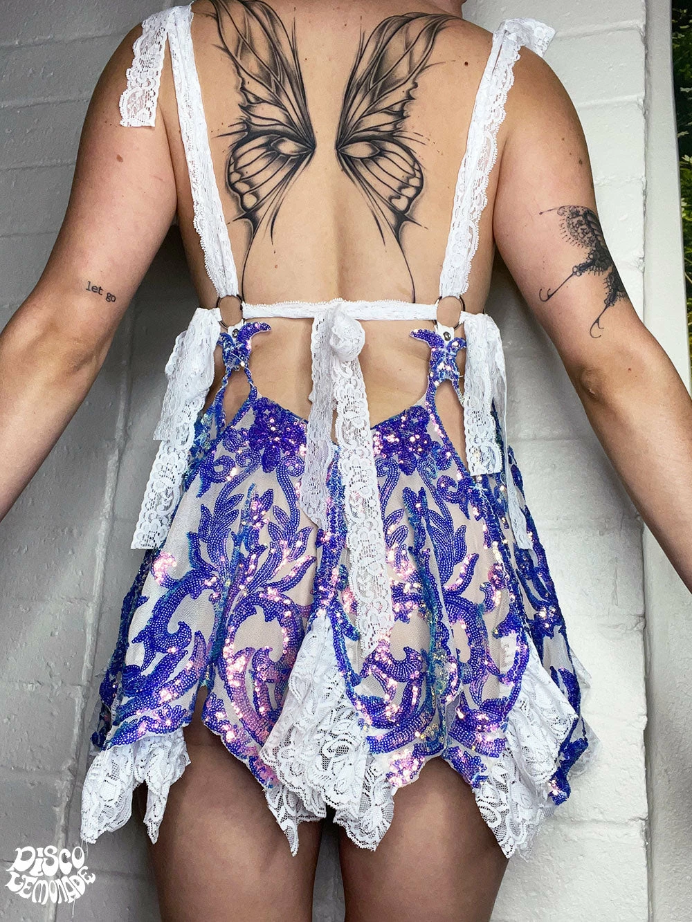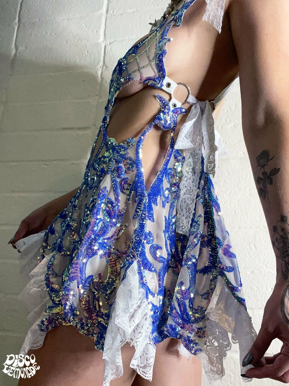 Iridescent swirl dress with gorgeous peekaboo cut outs & white lace detailing. Material is sequin on 4 way stretch mesh unlined.