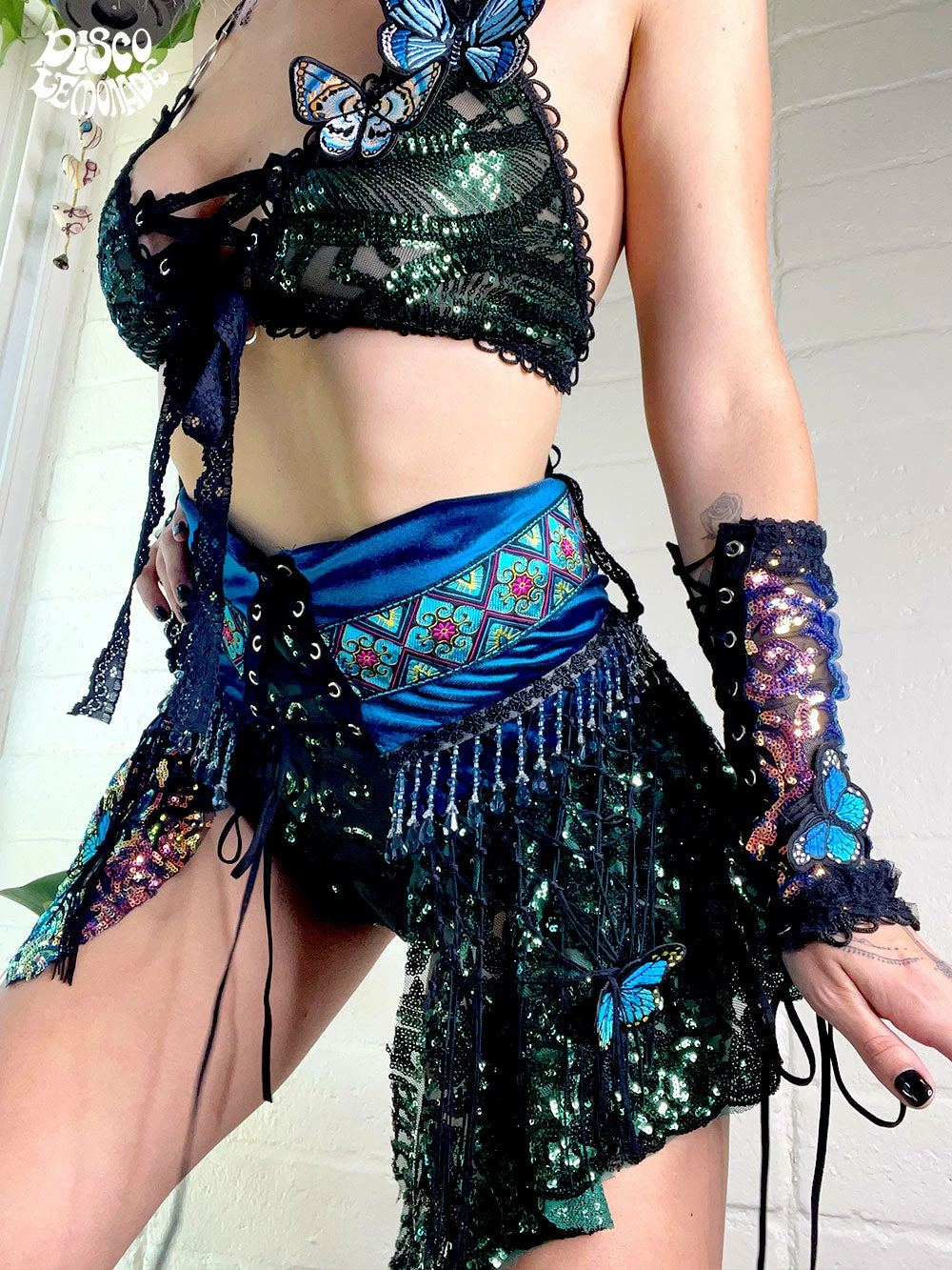 The cutest pixie bustle set that ever was. This set comes with a cut out sequin hardware lace up top, cuffs , lace up shorts and bustle.Â